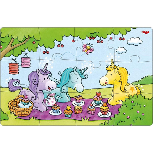 HABA 306164 Puzzles Einhorn Glitzerglück Rosalie & Friends, 2 x 12 Teile