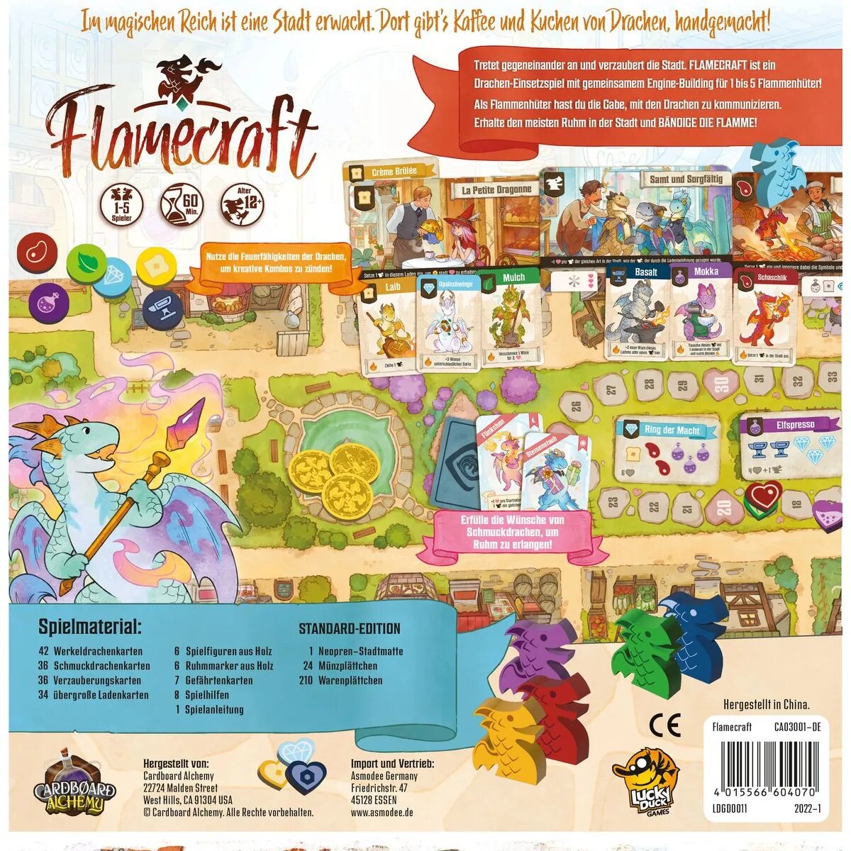 Im wunderschön illustrierten Familienspiel Flamecraft treten die Spieler als Flammenhüter gegeneinander an, um bekannter und erfolgreicher im Umgang mit der Flammenkunst zu sein als alle anderen in der Stadt. Sie steigern ihren Ruhm, indem sie Läden besuchen, dort Werkeldrachen einsetzen, Verzauberungen wirken und die Ziele ihrer geheimen Schmuckdrachen erfüllen.