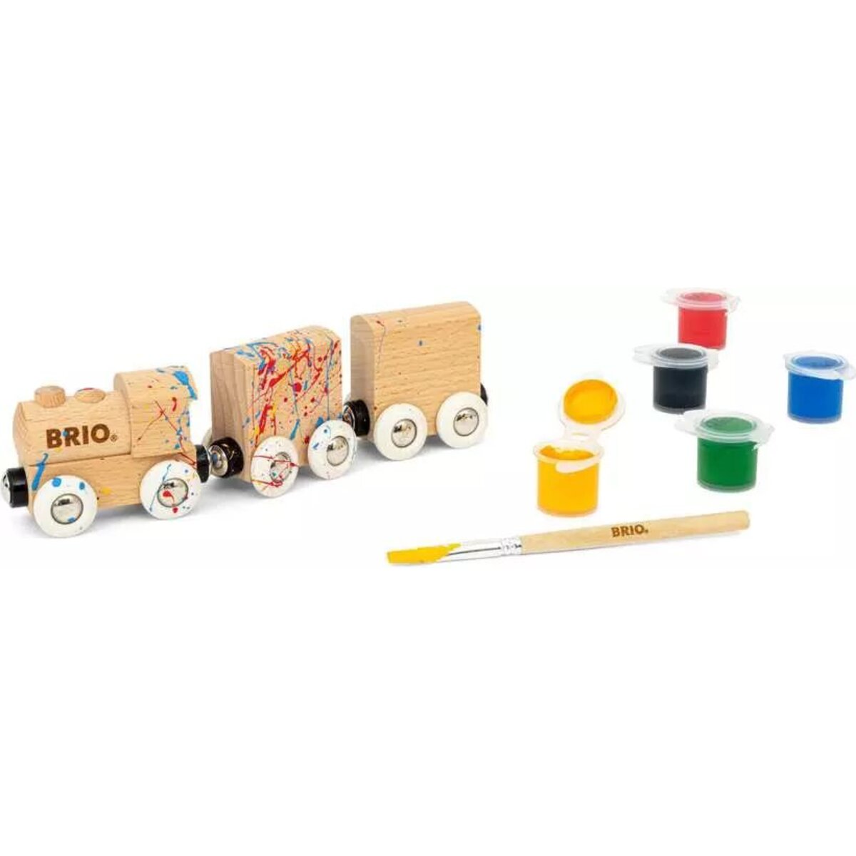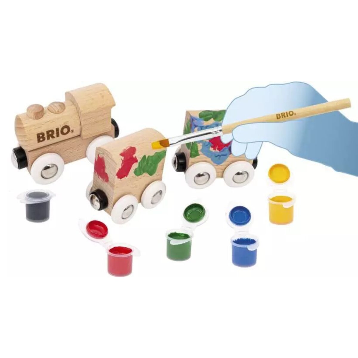 Mit dem Holzzug zum Anmalen kann eine ganz persönliche Spielzeugeisenbahn gestaltet werden. Dieser Holzzug ist für jeden kleinen Künstler wie eine leere Leinwand. Mit dem Pinsel und fünf wasserbasierten Acrylfarben können die Lieblingsfarben gemischt und ein eigenes Zugdesign erstellt werden. Bei einem Fehler oder neuer Inspiration kann die getrocknete Farbe einfach übermalt werden. Ob unsere klassischen BRIO-Designs oder etwas völlig Neues – die Gestaltung liegt ganz bei den kleinen Künstlern.