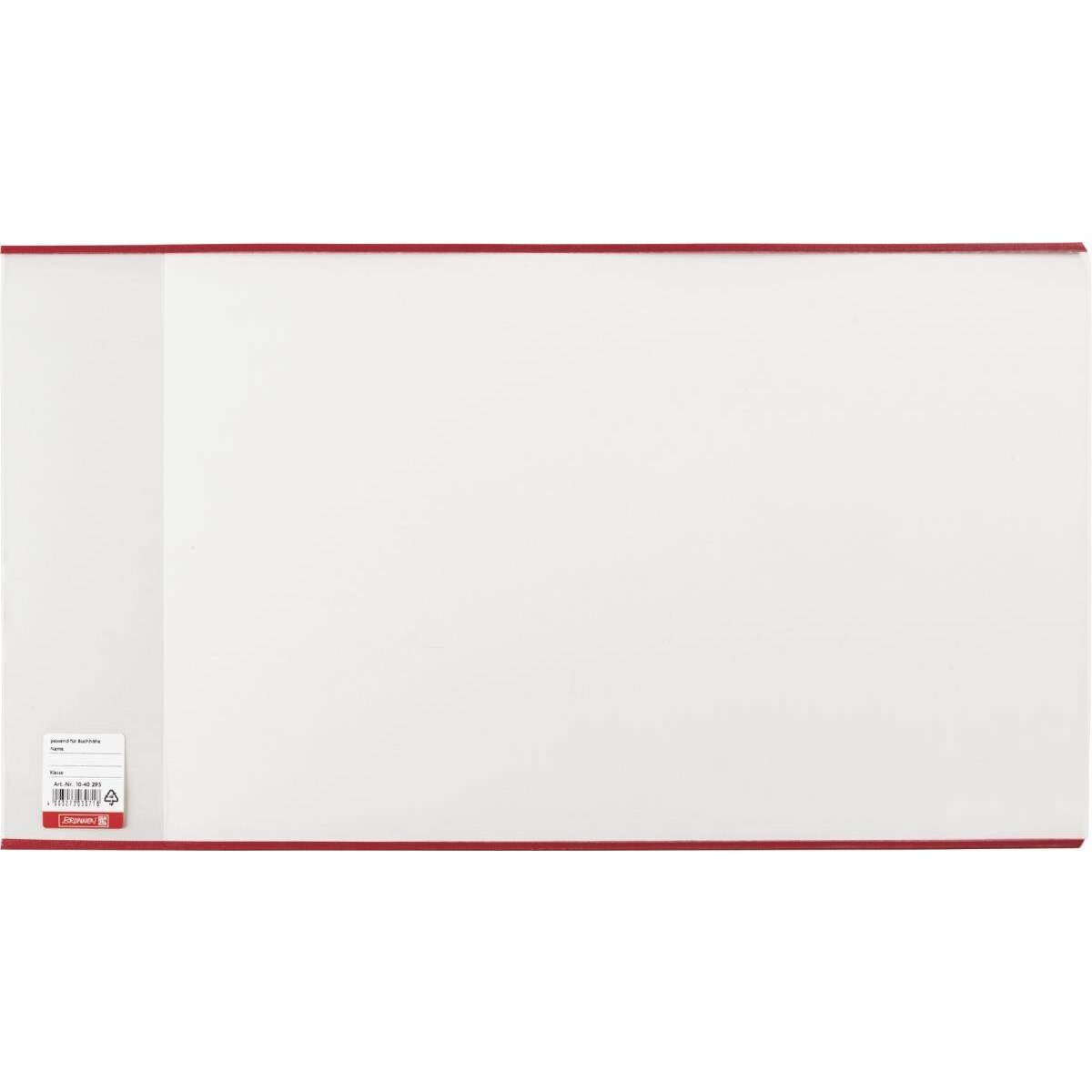 transparente Fertigeinbände aus Polypropylen mit roten Gewebebändern als Kantenschutz und Etikett zum Beschriften, in allen gängigen Buchgrößen erhältlich, einfaches Einschlagen und Festkleben