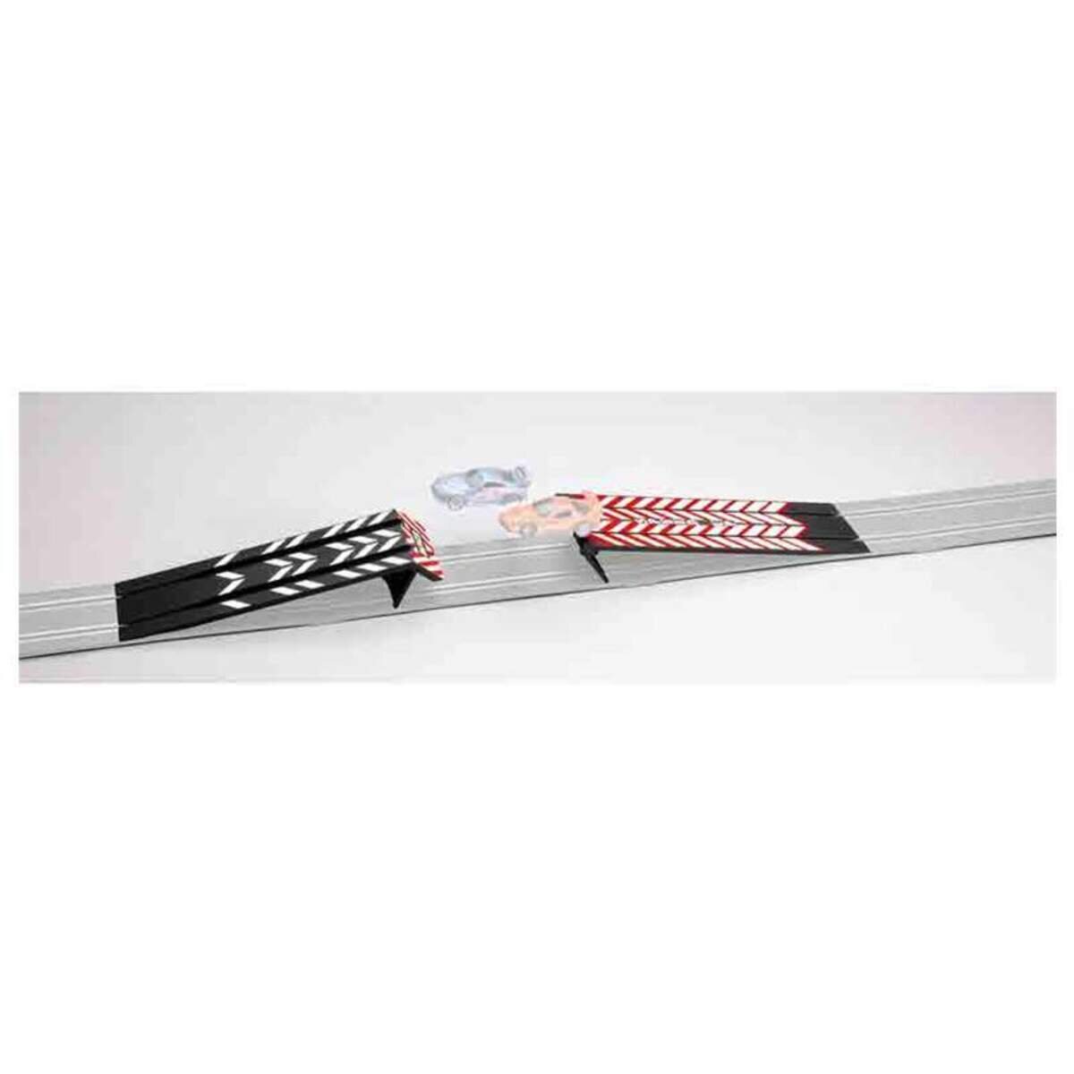 Wem wilde Verfolgungsjagden auf Geraden und in Kurven noch nicht genug sind, der wird an dieser Sprungschanze seine wahre Freude haben. Die Schanze besteht aus zwei Teilen, die einfach auf den Schienen der Bahn aufgelegt werden. Nun heißt es für Dich und Dein Fahrzeug: Ordentlich beschleunigen, Ziel anvisieren und mit vollem Tempo auf das erste Stück der Schanze fahren. Oben angekommen setzt Dein Auto zum Sprung an und sollte anschließend wieder in der Fahrspur des zweiten Schanzenstücks landen. Traut sich auch Dein Gegner dieses Manöver zu oder gibt er aus Angst zu wenig Gas und verpasst so das Anschlussstück? Beweise Mut und Talent, indem Du in den nächsten Rennen die Lücke zwischen der Schanze immer größer werden lässt. Die Sprungschanze ist für Carrera Bahnen mit dem Maßstab 1:43 geeignet.