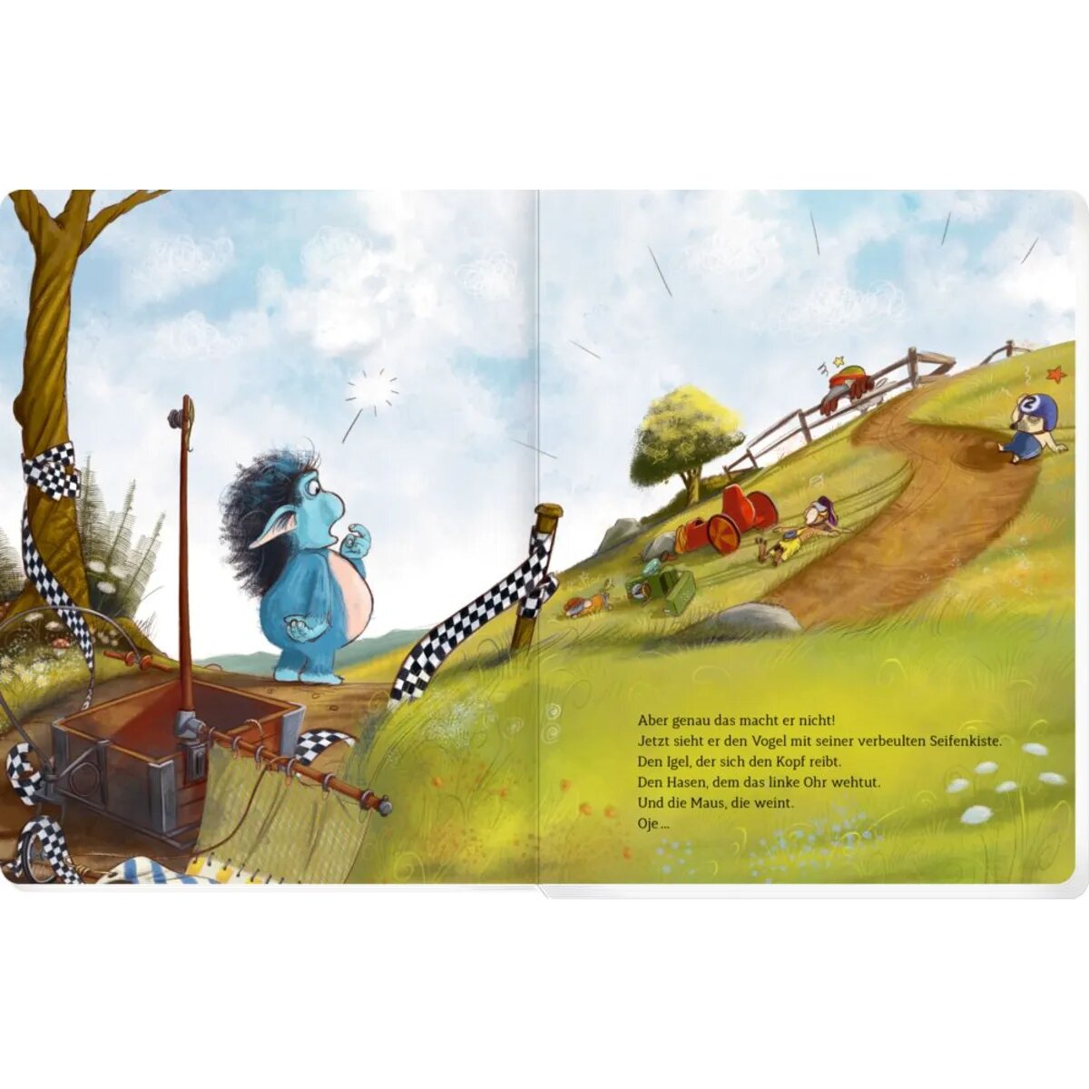 Der Grolltroll Band 3 – jetzt auch auf stabilen Pappseiten für die Kleinsten! Erster, Erster, Erster …! Der Grolltroll hat nur ein Ziel: Er will das Seifenkistenrennen gewinnen. Unbedingt. Er hat sich für seine Seifenkiste etwas Besonderes ausgedacht, und damit gelingt es ihm alle zu überholen. Der Vogel prallt erschrocken gegen die Leitplanke und der Igel gegen einen Stein. Die Maus verreißt ihr Lenkrad und der Hase kann nicht mehr bremsen. Jetzt hat der Grolltroll leichtes Spiel und rollt als Erster ins Ziel! Aber ist es wirklich so schön, Erster zu sein, wenn die Freunde auf der Strecke bleiben …? Nach einer Idee von aprilkind Erzählt von Barbara van den Speulhof und mit Illustrationen von Stephan Pricken.