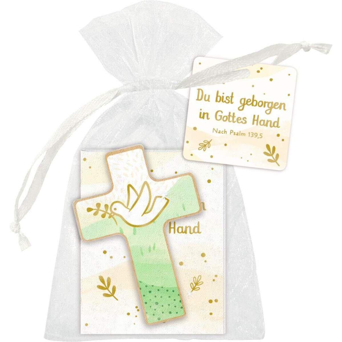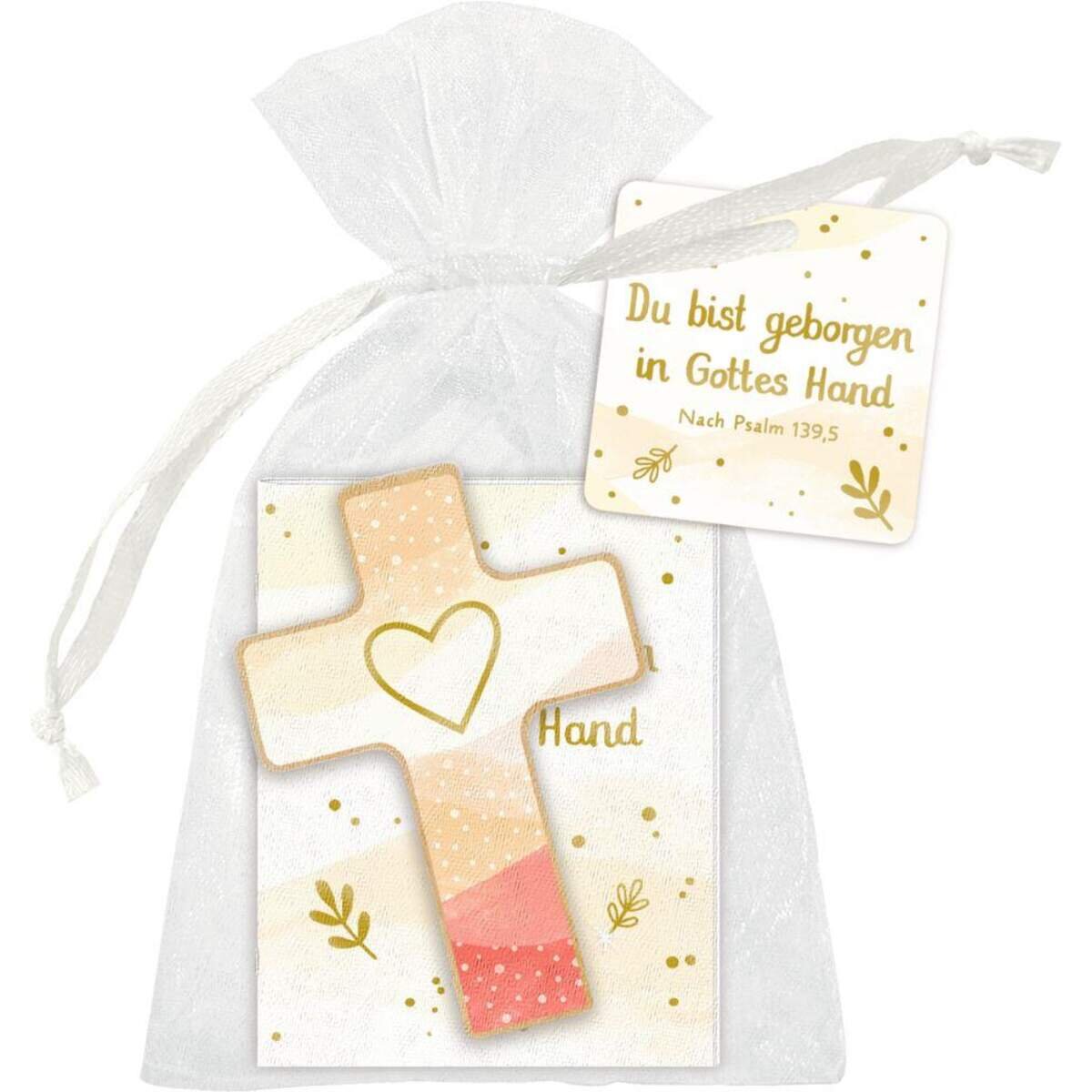 Dieses liebevoll gestaltete kleine Holzkreuz begleitet das Kind auf seinem Lebensweg. Es passt in – beinahe! – jede Tasche und fest in die Hand genommen, spendet es Trost und Zuversicht. Erhältlich in drei Designs, ist es zusammen mit einem kleinen Gebeteheft ansprechend in einem Organzasäckchen verpackt. Ein niedliches, symbolträchtiges Geschenk für ein christliches Fest.