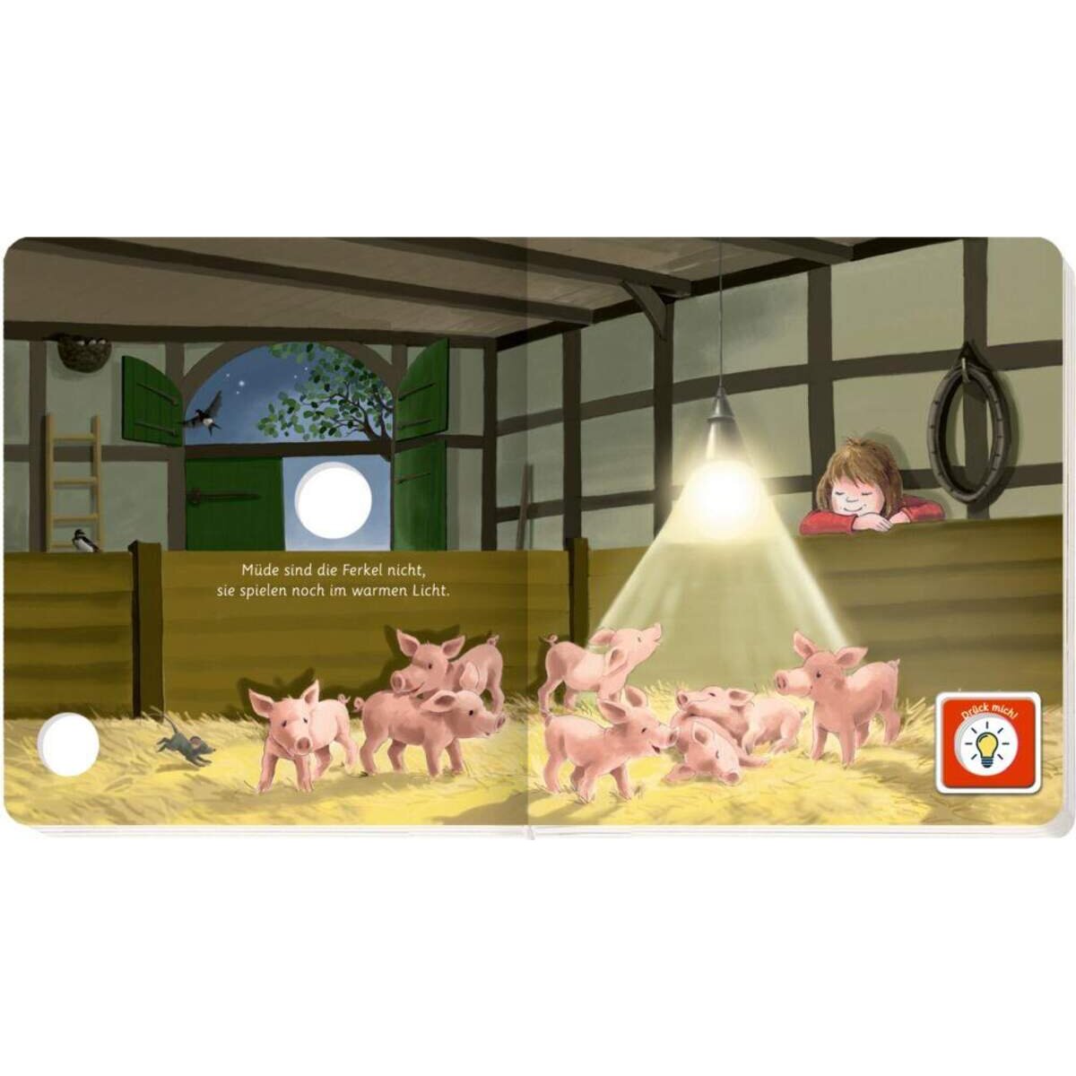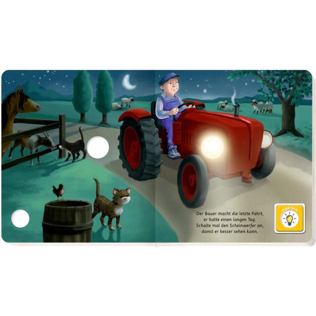 Licht an, Licht aus! Auf jeder Seite kann ein großes Licht an- und wieder ausgeknipst werden: im Stall, am Traktor und sogar am Lagerfeuer. Das macht schon den Kleinsten Spaß! Die liebevollen Illustrationen unterstreichen die faszinierende Wirkung der großen Leuchtfläche.