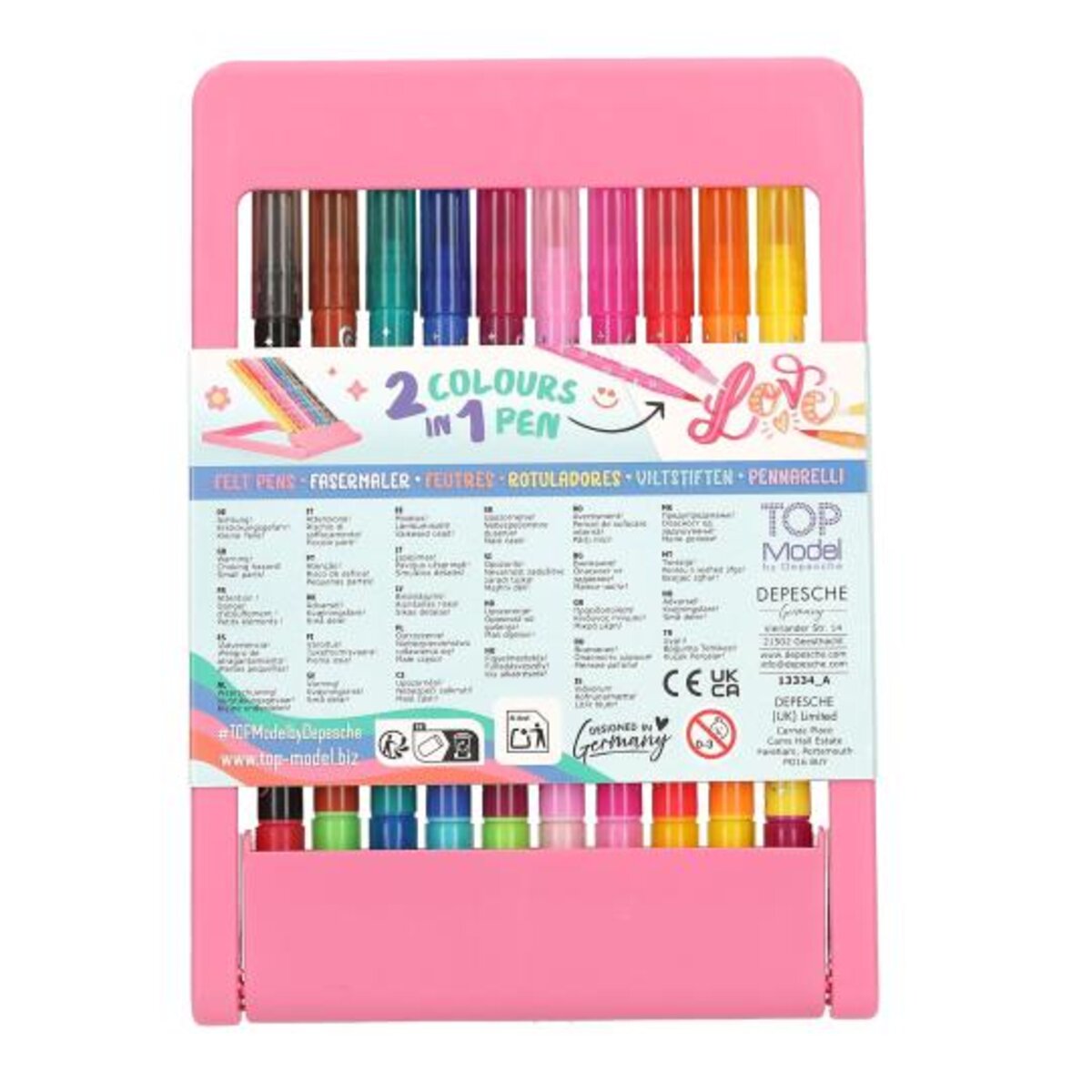Magisch schön malen mit den Magic-Doppel-Fasermalern von TOPModel: Jeder Stift hat eine farbige Pinselspitze (0,5-2 mm) und eine Magic-Spitze (0,5-2 mm). Malt man mit der Magic-Spitze über die zuvor gemalte Farbe, wechselt diese ihren Ton! 10 Stifte im Set mit praktischem Aufstellerzum überall mit hinnehmen.
