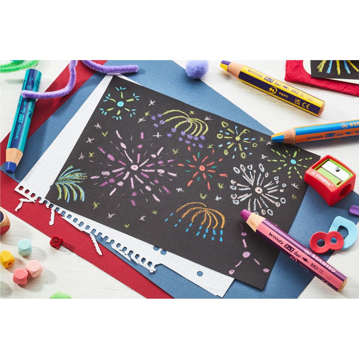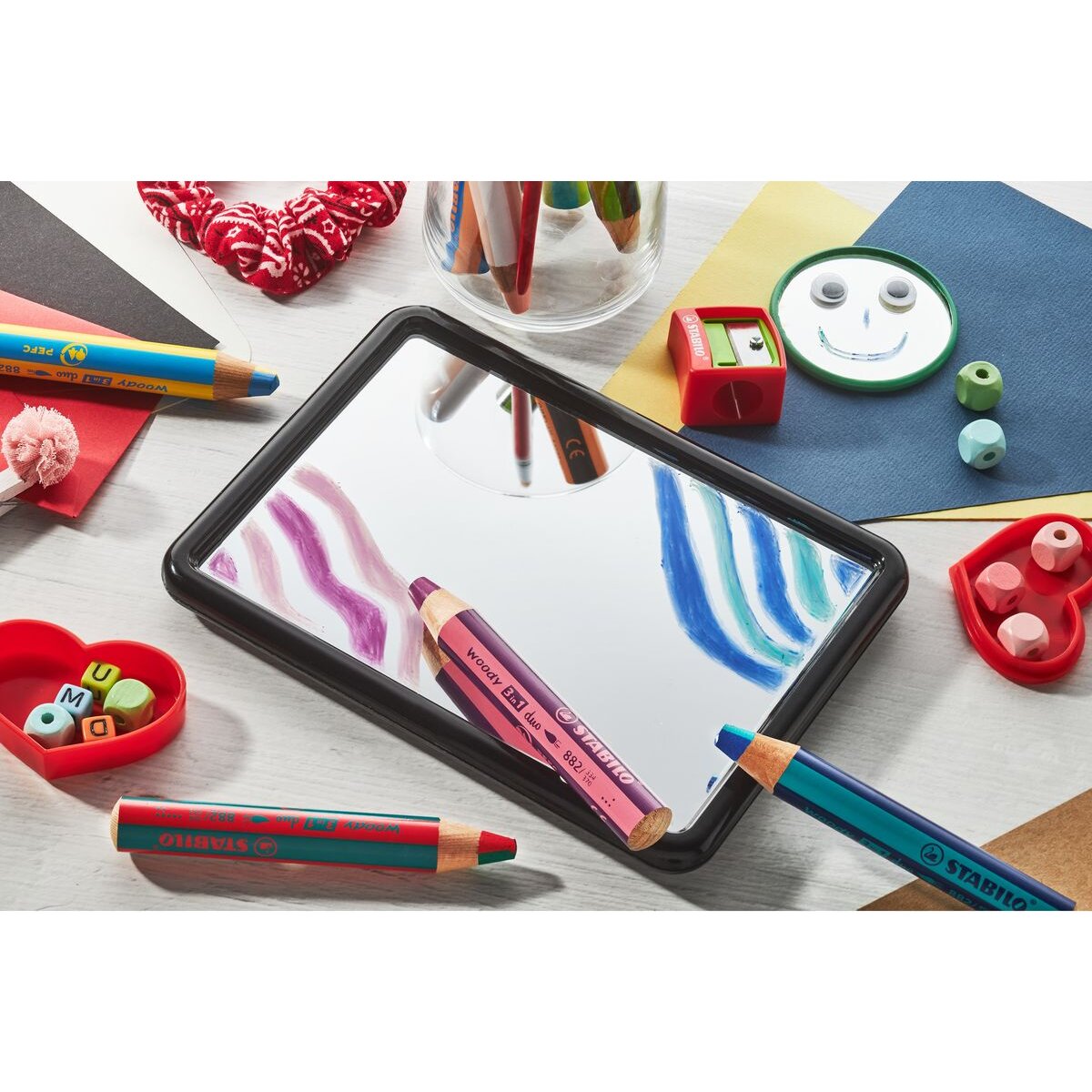 STABILO woody 3 in 1. Multitalent-Stift für die kleinen Künstler:innen, die mit viel Farbe malen und sich kreativ austoben und Hobbykünstler mit hohen Ansprüchen. Das außergewöhnliche Multitalent: Buntstift, Wassermalfarbe und Wachsmalkreide in einem. Hergestellt aus 100% PEFC-zertifiziertem Holz. XXL-Mine: 1 STABILO woody = 8 Standard-Buntstifte. Perfekt für große Flächen und fast alle Maltechniken. Wegen seiner dicken Form ideal für Kinderhände: der Stift ist gut zu greifen. Bruchsichere Mine, Durchmesser 10 mm. Ergiebige Farben. Hohe Deckkraft und Farbintensität, auch auf dunklen Papieren. Satter, samtweicher Abstrich. Malt auch auf glatten Oberflächen wie Glas, Metall, Leder etc. Lässt sich von glatten Oberflächen mit Wasser entfernen.