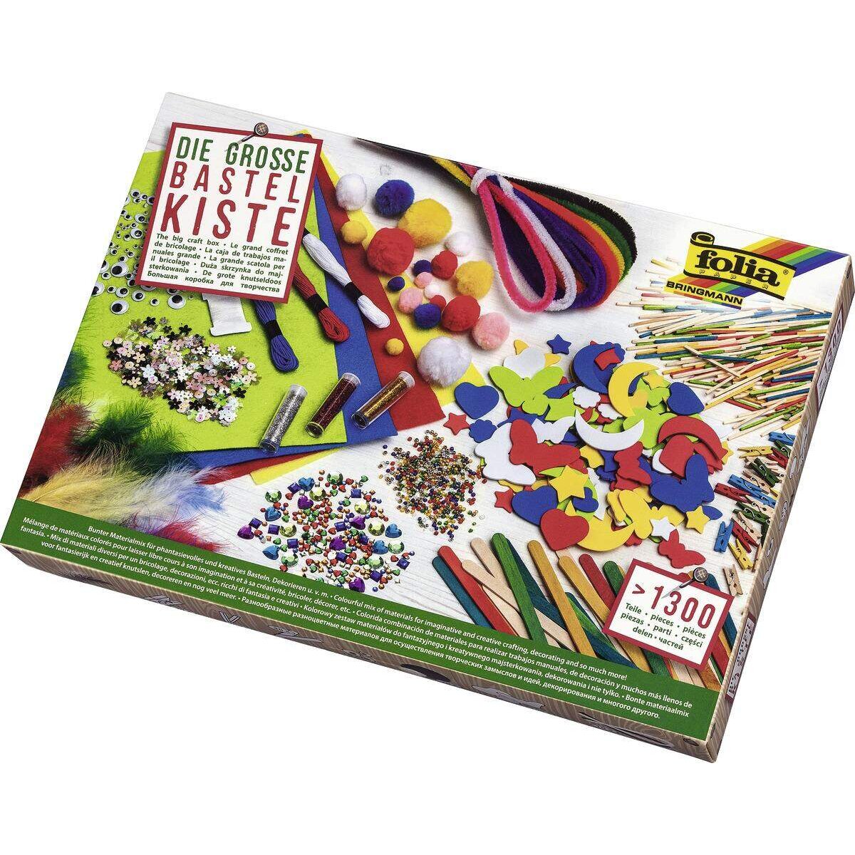 Die große Bastelkiste von Folia enthält über 1300 Teile und lässt die Herzen kreativer Köpfe höher schlagen. Der bunte Materialmix ist ideal für viele phantasievolle und kreative Bastel- und Gestaltungsideen. Enthalten sind 100 Wackelaugen (sortiert in verschiedenen Größen), 4 Bögen Bastelfilz (ca. 20 x 30, farbig sortiert), 150 Moosgummistanzteile, 200 Schmucksteine, 10 Chenilledrähte (farbig sortiert), 20 Pompons (farbig sortiert), 30 Holzklammern, 200 Bastelhölzer, 30 Holzstäbchen, 400 Perlen, 200 Pailetten, 20 Flauschfedern, 3 Stickgarn (á 8 m, farbig sortiert), 3 Glitterpuler und 1 Nylonfaden (ca. 0,2 mm x 10 m). Die Bastelkiste ist auch für Kinder bestens geeignet um ihrer Kreativität freien Lauf zu lassen.