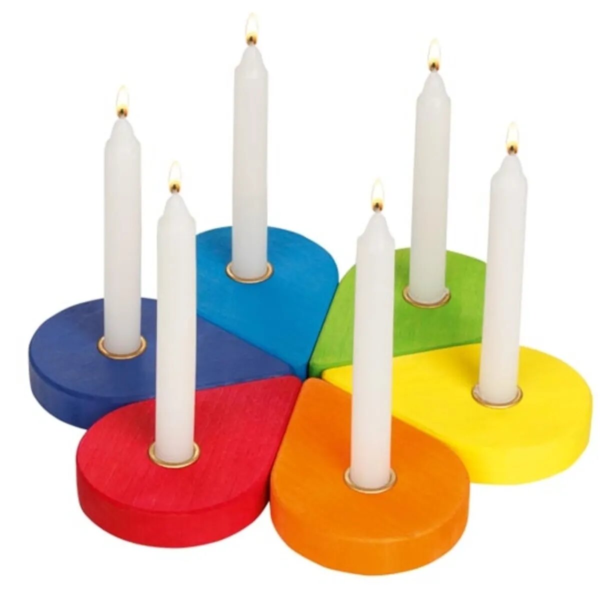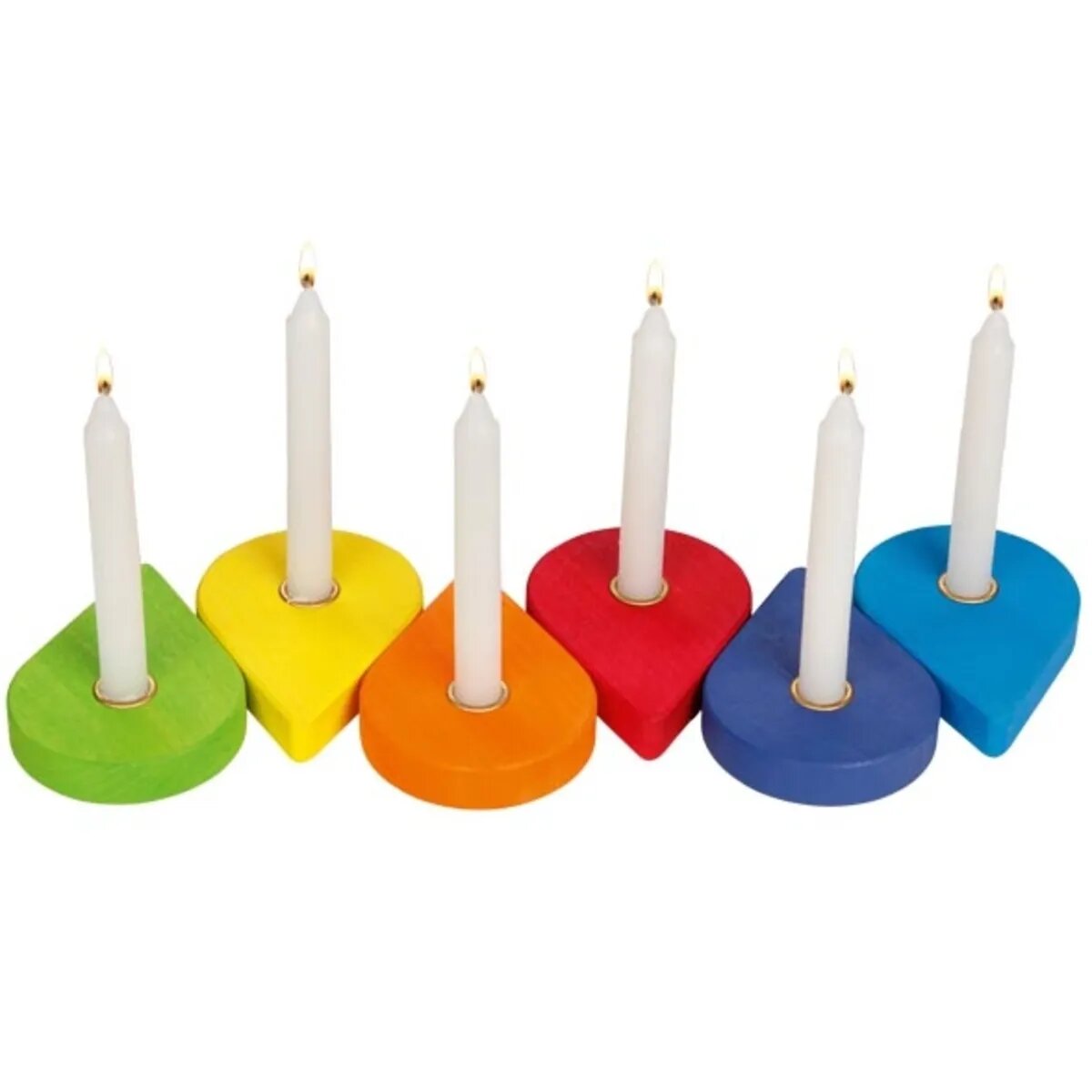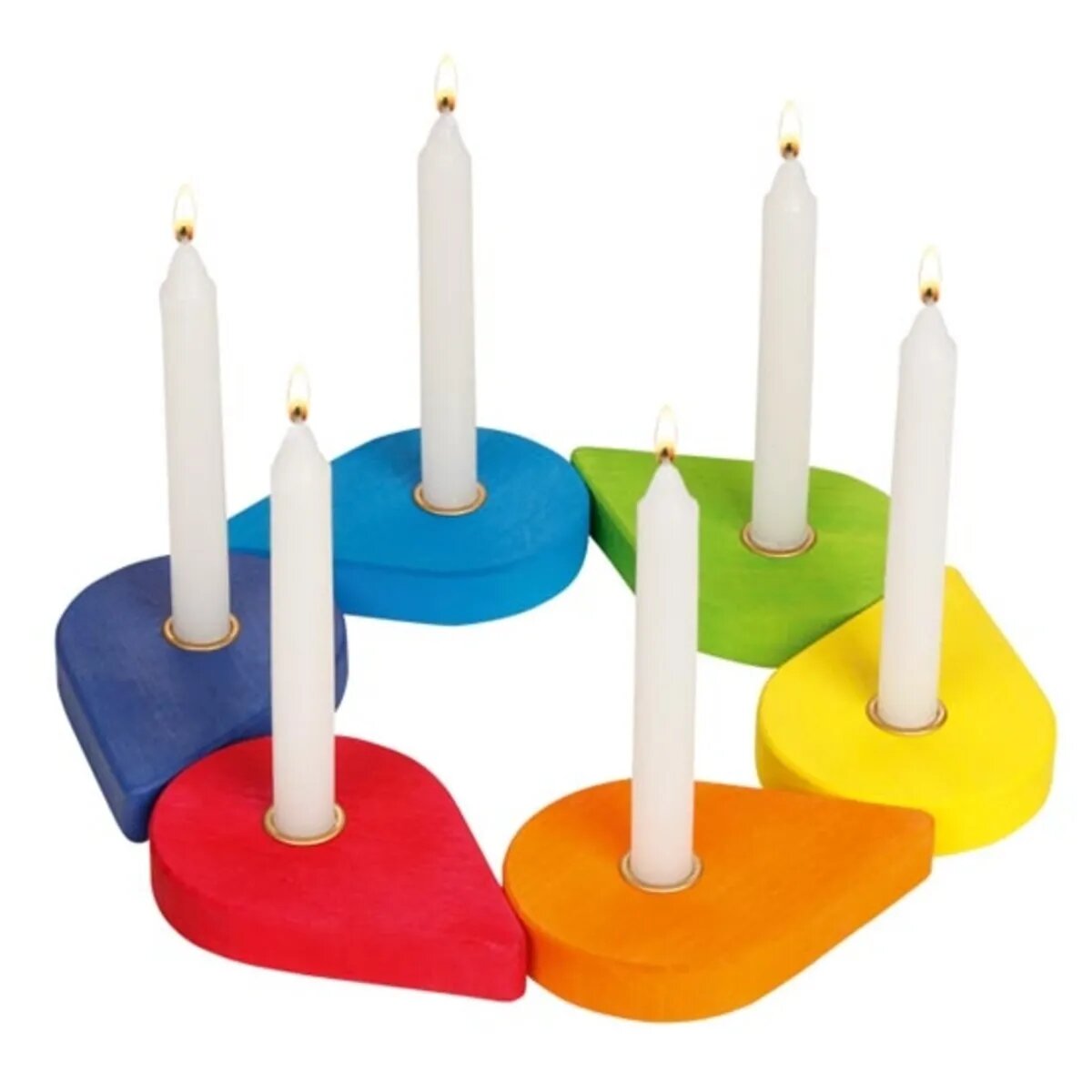 Geburtstagskranz einmal anders: Die 6 Kerzenhalter aus Holz leuchten in den Farben des Regenbogens und können individuell und kreativ auf dem Geburtstagstisch angeordnet werden.