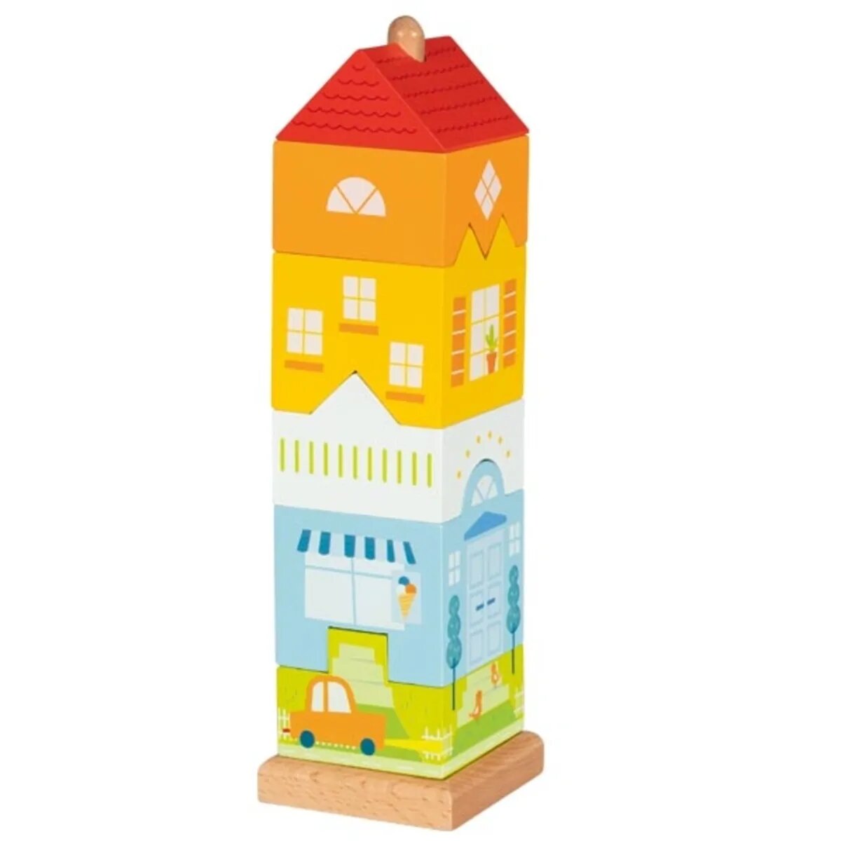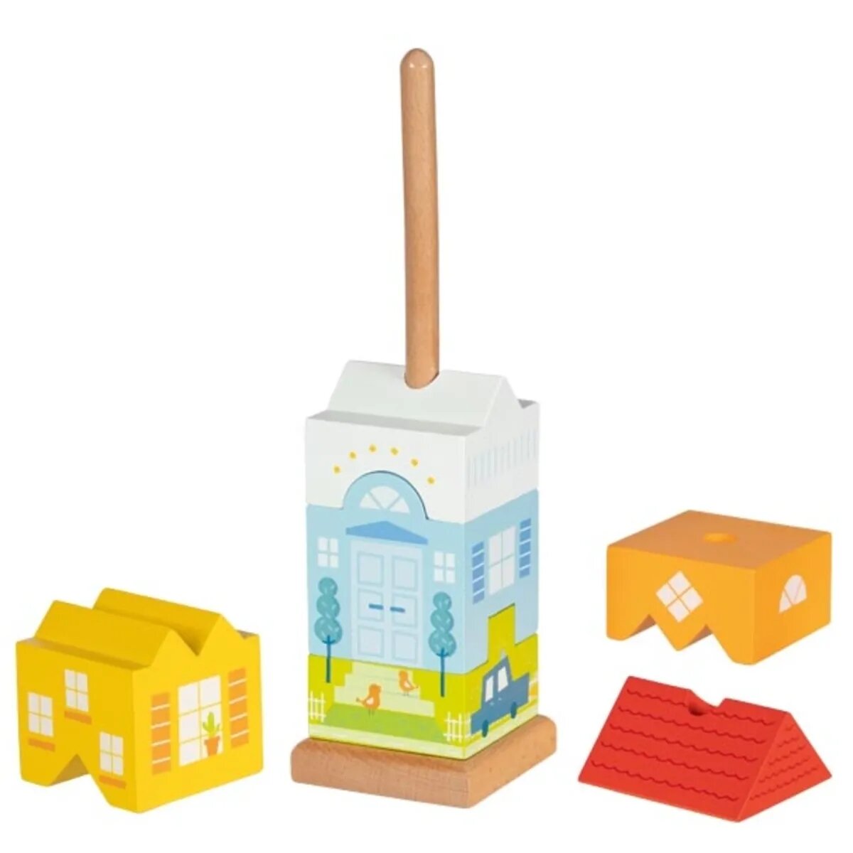 Ein kunterbunter Turm aus Holz. Damit die Stadtvilla aber wirklich so schön aussieht und sich in die Höhe reckt, müssen erst 6 Klötzchen passgenau aufeinandergesetzt werden. Gott sei Dank hält der Stab in der Mitte alles im Lot. Wenn es denn richtig gestapelt wurde. So wird das Formenverständnis mit diesem Stapelturm spielerisch geschult.