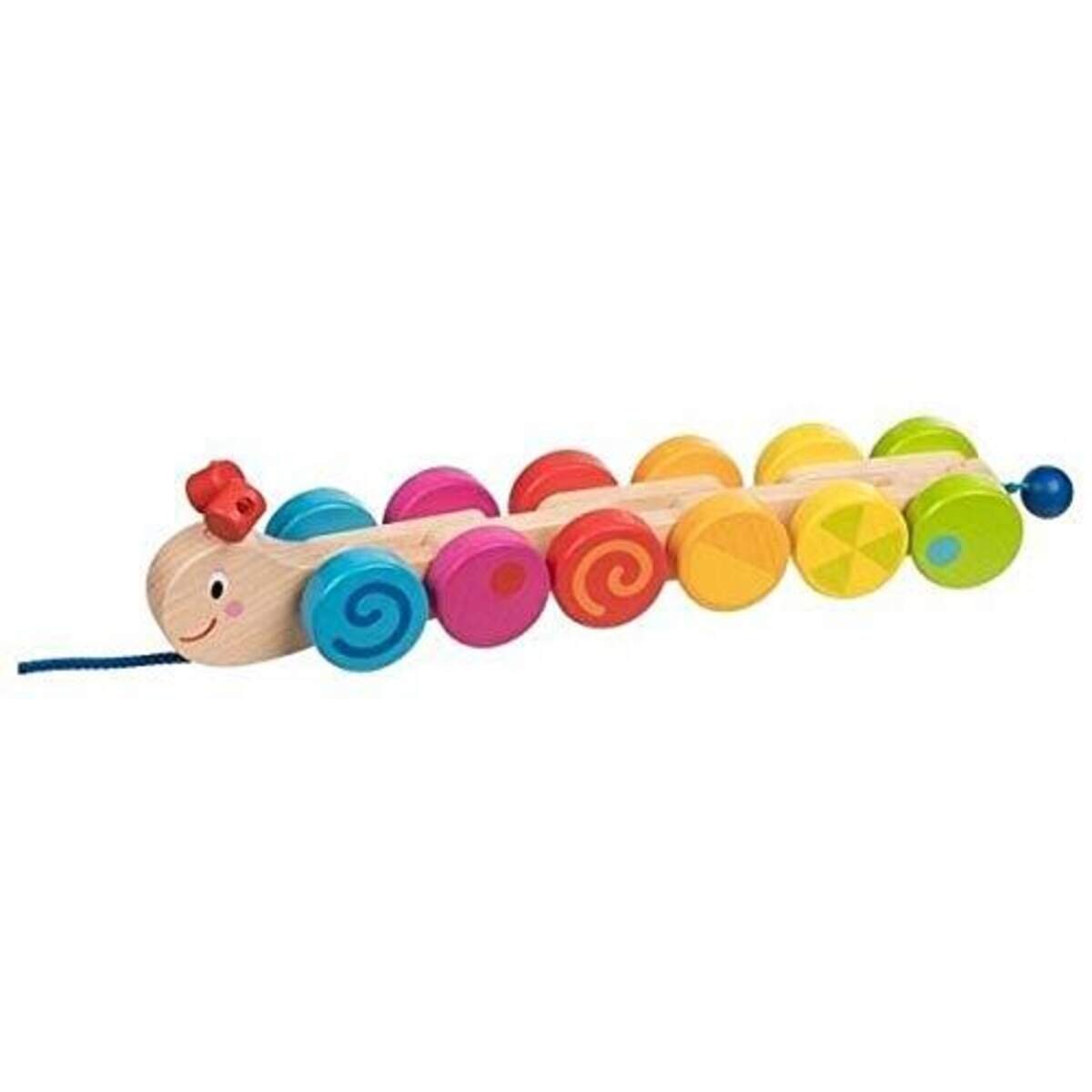 Selten kam eine Raupe aus Massivholz so farbenfroh daher. Die sich ineinanderschiebenden Glieder verleihen ihr einen unverwechselbaren Gang. Der Clou sind die unterschiedlich gestalteten aufeinander abgestimmten Räder, die den Lauf der Raupe mit einem farbenfrohen Farbspiel begleiten. Doch damit nicht genug: Die einzelnen Glieder lassen sich zu einer Pyramide stapeln und die Raupe lässt sich weiterhin uneingeschränkt weiterziehen.