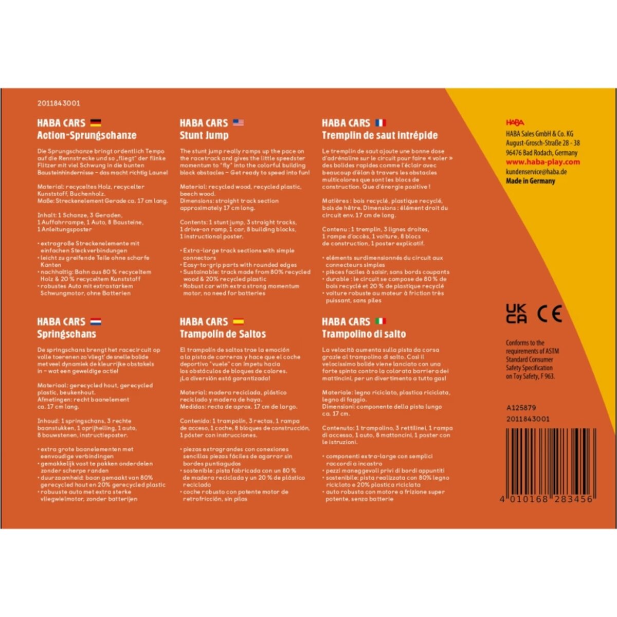 Die Sprungschanze sorgt für rasantes Tempo auf der Rennstrecke, sodass der schnelle Flitzer mit viel Schwung in die bunten Bausteinhindernisse „fliegt“ – das bringt richtig Spaß! Kombinierbar mit allen HABA Cars Sets für noch mehr actionreichen Spaß auf und neben der Rennbahn.