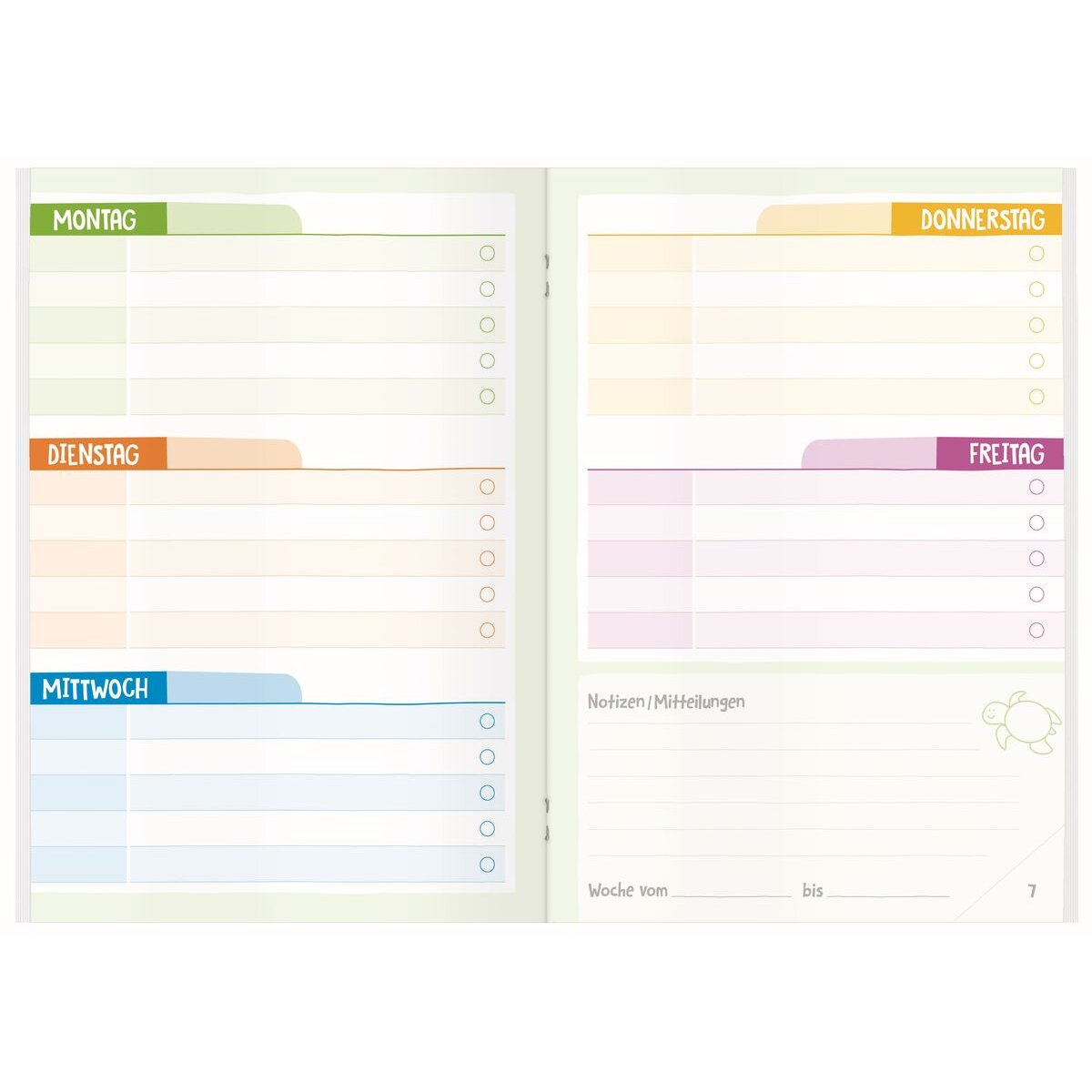 Jetzt wird es bunt: das Hausaufgabenheft für die Grundschule ohne Datumsbindung, jeder Wochentag in einer anderen Farbe