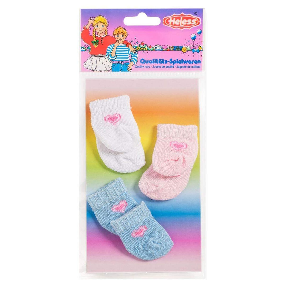 Heless Qualitätsspielwaren - Mit Liebe zum Design! Diese Puppensöckchen sind nicht nur kuschelig weich, sondern auch äußerst elastisch und passen somit unterschiedlichsten Puppen. Ein wichtiger Basicartikel für alle Puppenmuttis. Sie erhalten in diesem farbenfrohen Set 3 Paar Söckchen passend für einer Puppengröße von 28 - 35 cm. Bei Bedarf können die Puppensöckchen gewaschen werden (Handwäsche).