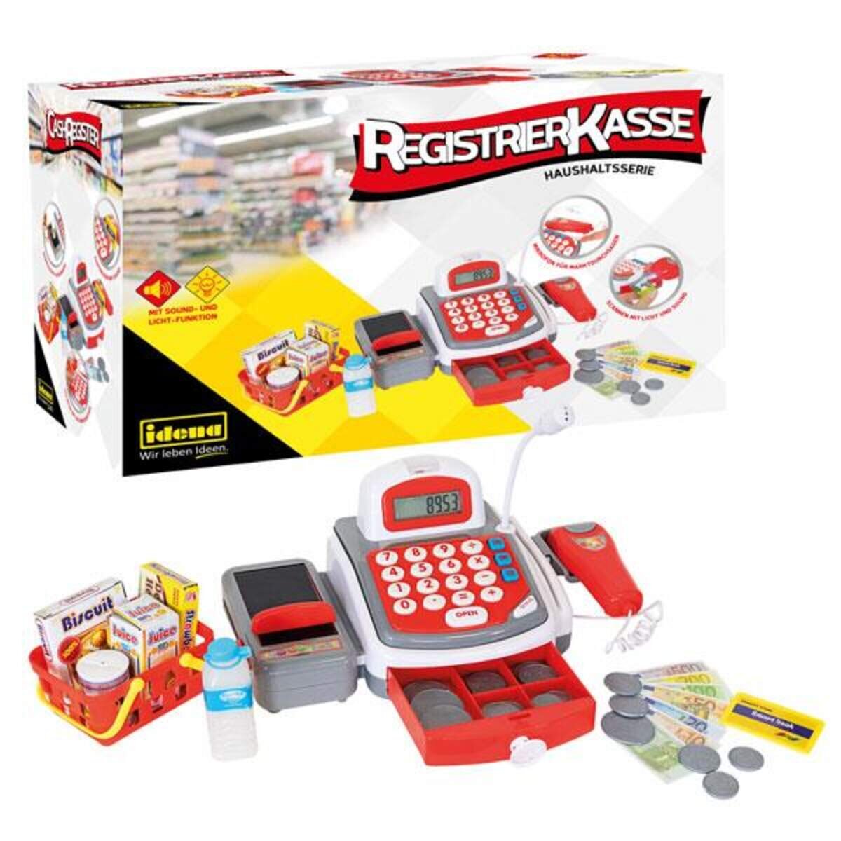 Die Idena Registrierkasse mit Licht- und Soundeffekten ist ein tolles Spielzeug für Kinder, die gerne Rollenspiele spielen. Ausgestattet mit einem Handscanner und einem beweglichen Kassenband bietet diese Registrierkasse ein realistisches Einkaufserlebnis. Das Mikrofon kann für Durchsagen genutzt werden, während die mitgelieferte Bankkarte und das Spielgeld das Spielen noch realistischer machen. Ein Einkaufskorb und Spielzeuglebensmittel wie Wasser, Milch, Kekse und Kuchen runden das Spielset ab. Die Registrierkasse ist ca. 30 x 12 x 17 cm groß, besteht aus Kunststoff und wird batteriebetrieben.