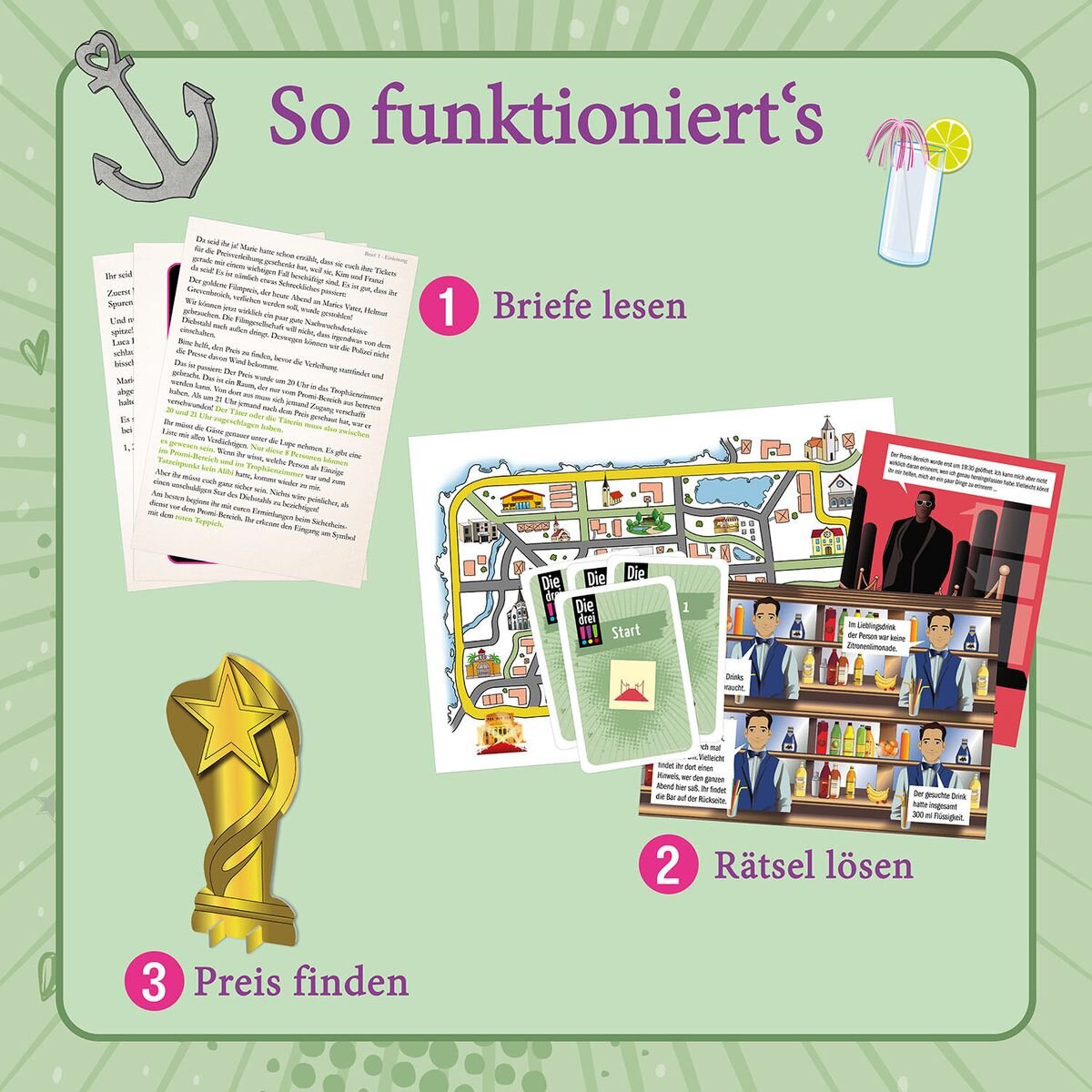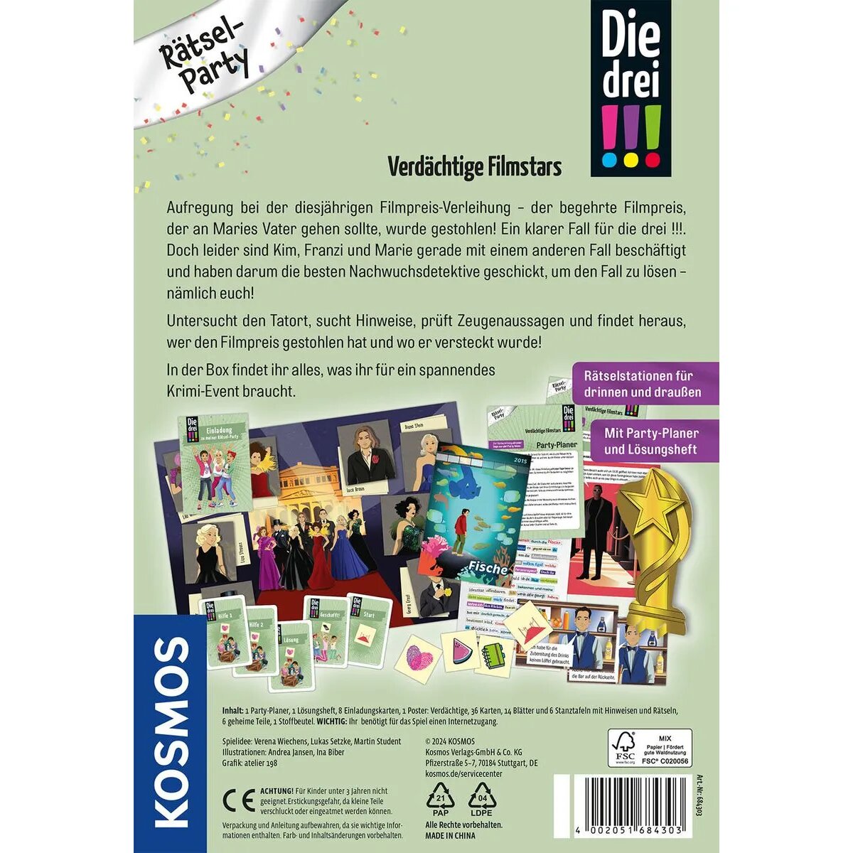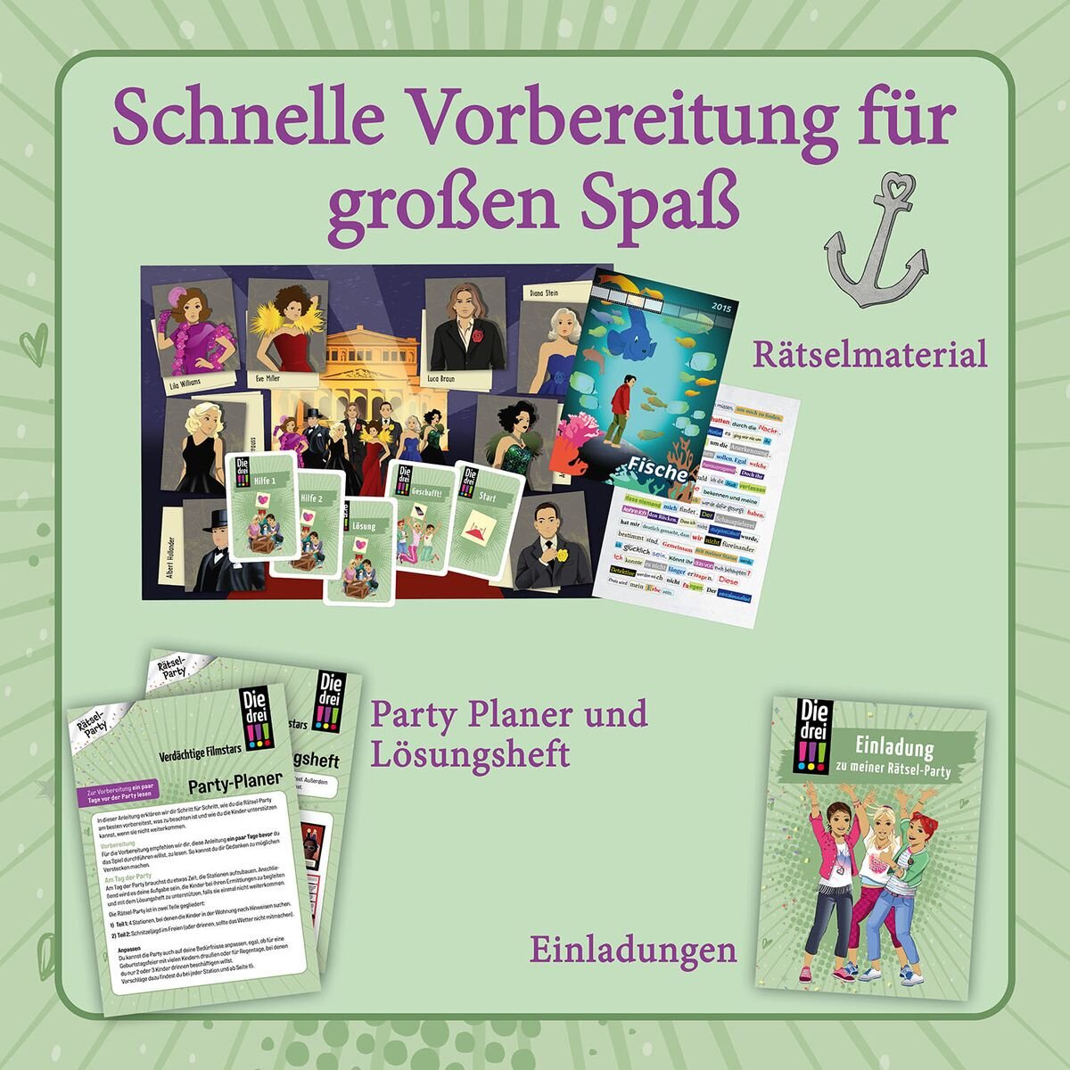 Diebstahl bei der Award Show! Eigentlich sollte Maries Vater den Preis für seine Filmrolle erhalten, doch die Statue ist verschwunden. Ausgerechnet jetzt sind die drei !!! nicht da, um sich selbst um den Fall zu kümmern. Das übernehmen die zwei bis acht Kinder ab neun Jahren im Team. Ein Spielleiter oder eine Spielleiterin verteilt Hinweise in der Wohnung und im Freien. Dann startet der Rätselspaß: In Teil eins werden die Gegenstände gesammelt, die den Täter entlarven. In Teil zwei geht es um die Suche nach der Statue – auch in Form einer Schnitzeljagd. Ein lustiges Krimi-Eventspiel mit abwechslungsreichen Rätseln: wenig Vorbereitungsaufwand für Eltern – großer Spaß für kleine Nachwuchs-Detektive.