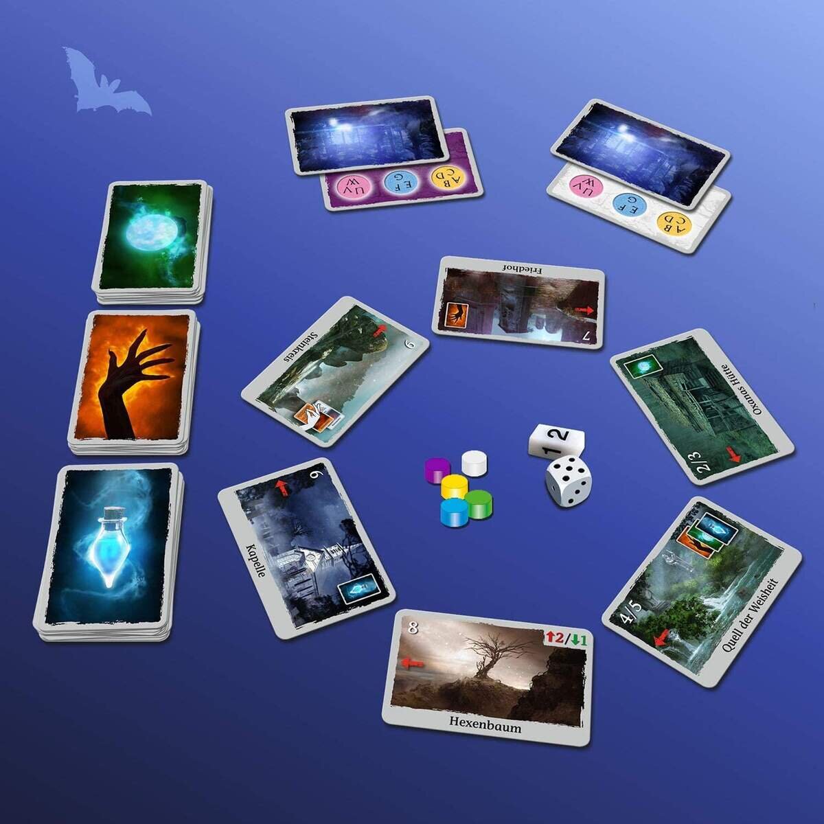 Inhalt: 8 Spielfiguren, 8 Schadensmarker, 1 Schadensskala, 86 Spielkarten, 2 Würfel, 1 Anleitung