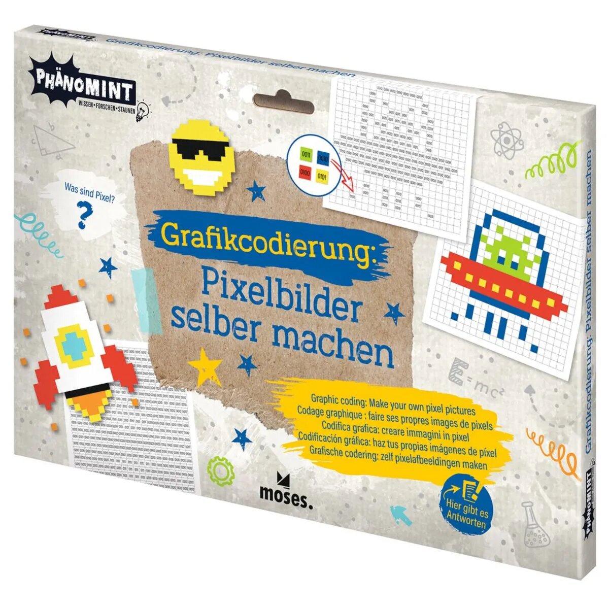 Was sind Pixel? Was ist ein Binärcode? Und wie stellt der Computer ein Bild eigentlich genau dar? In diesem Set können Kinder die Antworten nicht nur lernen, sondern auch gleich mal ausprobieren! Das Grafikcodierung-Set vermittelt ein erstes Verständnis für die Entstehung und Darstellung von Computerbildern und sorgt dabei für jede Menge kreativen Sticker-Spaß. Und so funktioniert’s: Die Codes auf den enthaltenen Code-Karten müssen mithilfe der Decodierungshilfe entschlüsselt und anschließend mit den Pixel-Aufklebern beklebt werden. Im Nu entsteht aus einem vermeintlichen Zahlen-Wirrwarr ein buntes Pixelbild mit tollemMotiv! So lernen wissbegierige Kids nicht nur alles über digitale Bilder, Codes und Pixel, sondern fördern gleichzeitig auch ihre Kreativität, Motorik und Konzentration. Für besonders kreative Köpfe liegen zwei Blanko-Karten für eigene Pixelbild-Kreationen bei, die nach Belieben beklebt werden können.