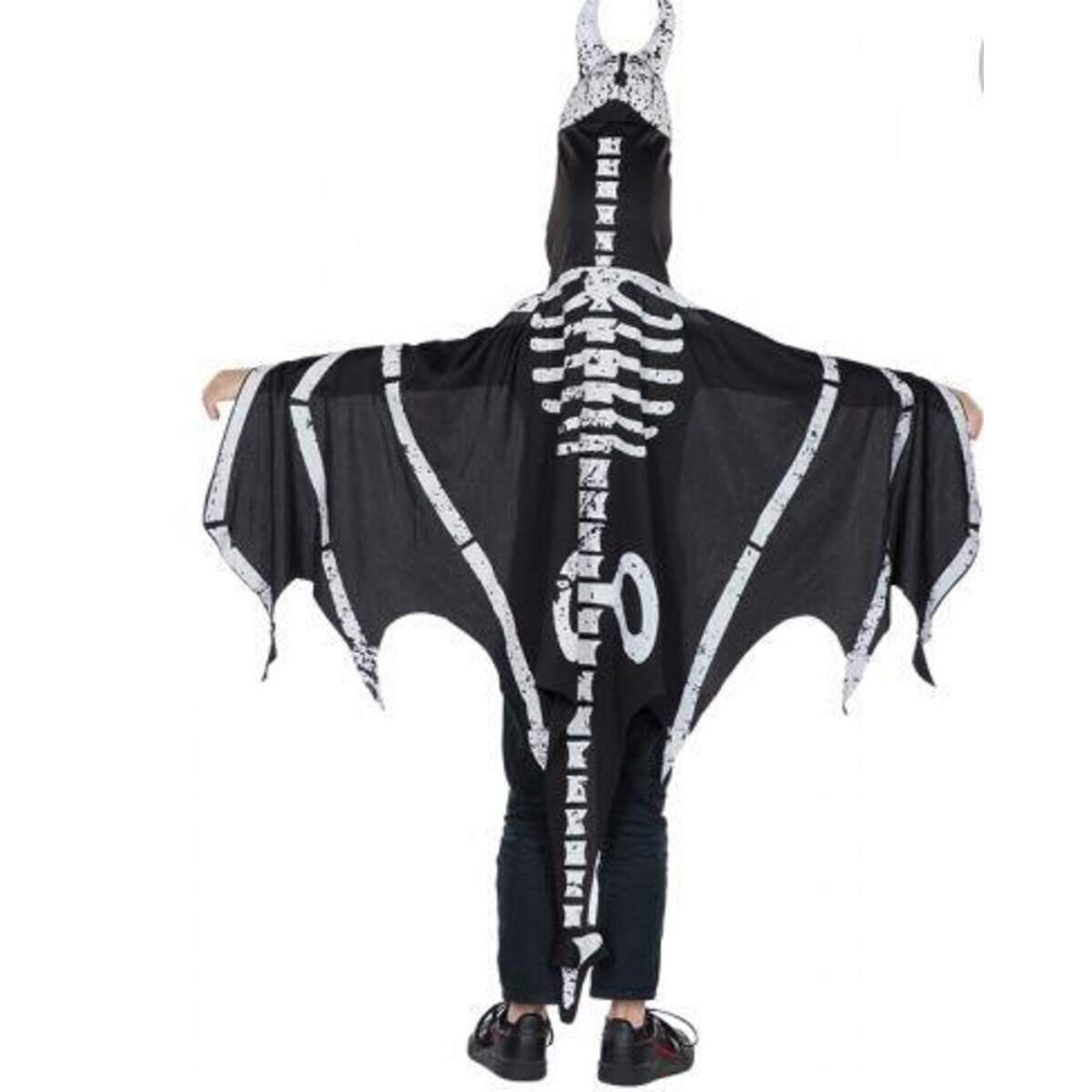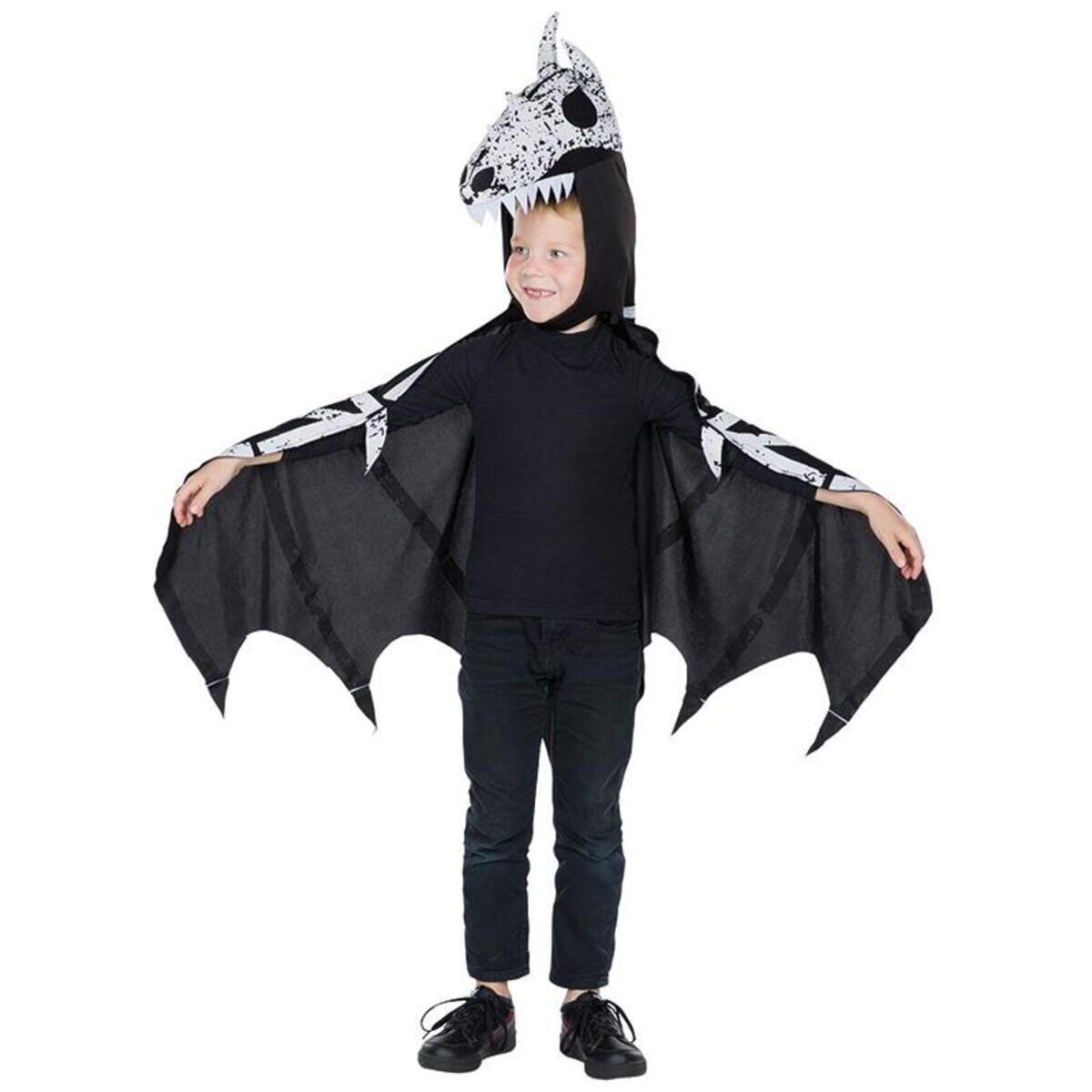 Schwarzes Kapuzencape mit gezacktem Saum, das hinten spitz in einen Saurierschwanz ausläuft und auf dem die weißen Skelettknochen eines Flugsauriers aufgedruckt sind. Die Seiten des Capes können mittels eines Bands mit Klettverschluss an den Armen befestigt werden. Die gepolsterte Kapuze ist in Form eines Dinosaurierschädels gehalten und mit einer Reihe Stoffzähnen besetzt.