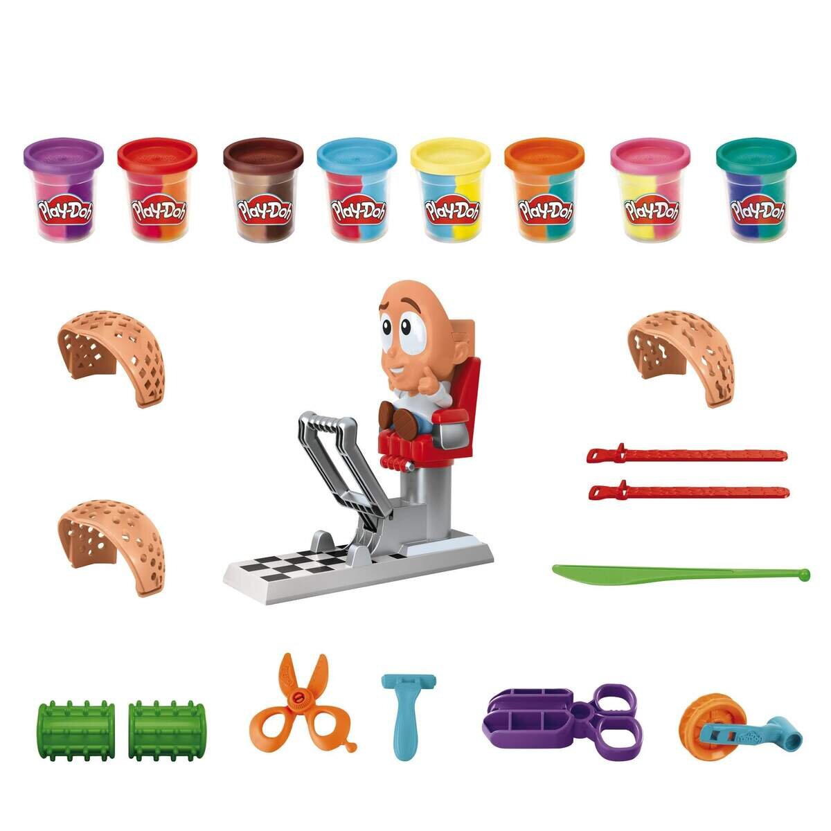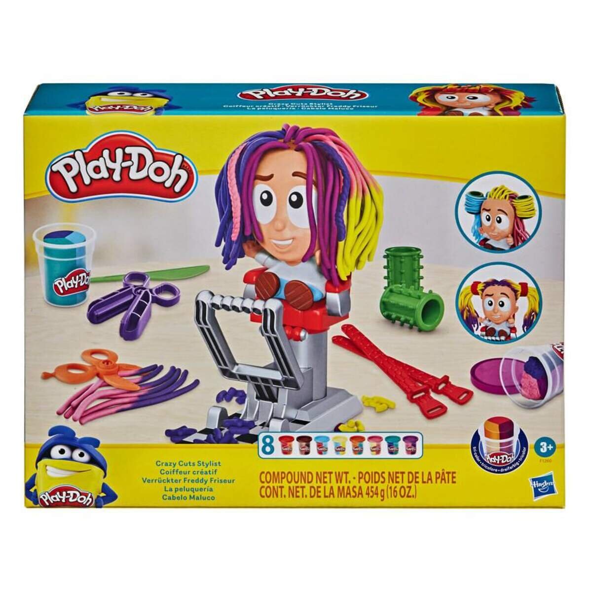 Willkommen im Haarsalon vom verrückten Freddy Friseur! Hier können Kinder ab 3 Jahren in die Rolle eines Friseurs schlüpfen und ihrem Kunden die lustigsten und kreativsten Frisuren zaubern. Wenn die Haare immer länger und länger werden, geht es im Haarsalon rund. Dank 3 austauschbarer Haarteile entstehen Frisuren in verschiedenen Looks und die 8 dreifarbigen Play-Doh Dosen à 56 g bieten kunterbunten Haarspaß. Mit der Play-Doh Schere und dem Spielrasierer wird die Frisur in Form gebracht und danach beginnt der Spaß von vorn! Dieses Play-Doh Spielset ist ein tolles Geburtstags- oder Weihnachtsgeschenk für alle kleinen Hobbyfriseure.