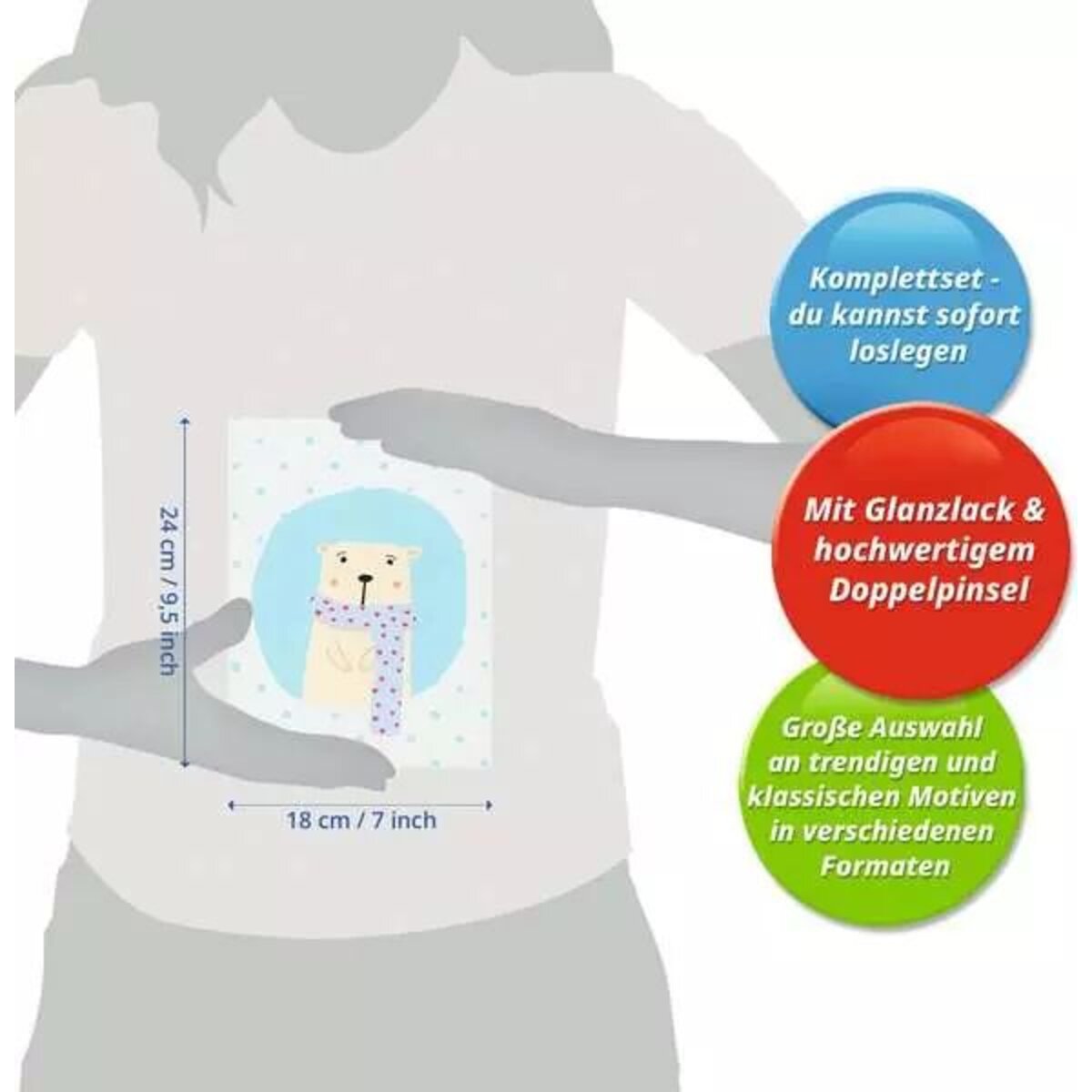 Coole Motive, leuchtende Farben und glänzender Lack für ein perfektes Finish. Das trendige Motiv Hello Baby: Cute Polar Bear sorgt für großartigen Malspaß für Erwachsene ab 12 Jahren. Die Motivlinien sind bereits aufgedruckt und nummeriert und werden mit den fertig gemischten Acrylfarben ausgemalt. Das ist Malspaß mit Erfolgsgarantie für einen einzigartigen Wandschmuck. So einfach war malen noch nie!