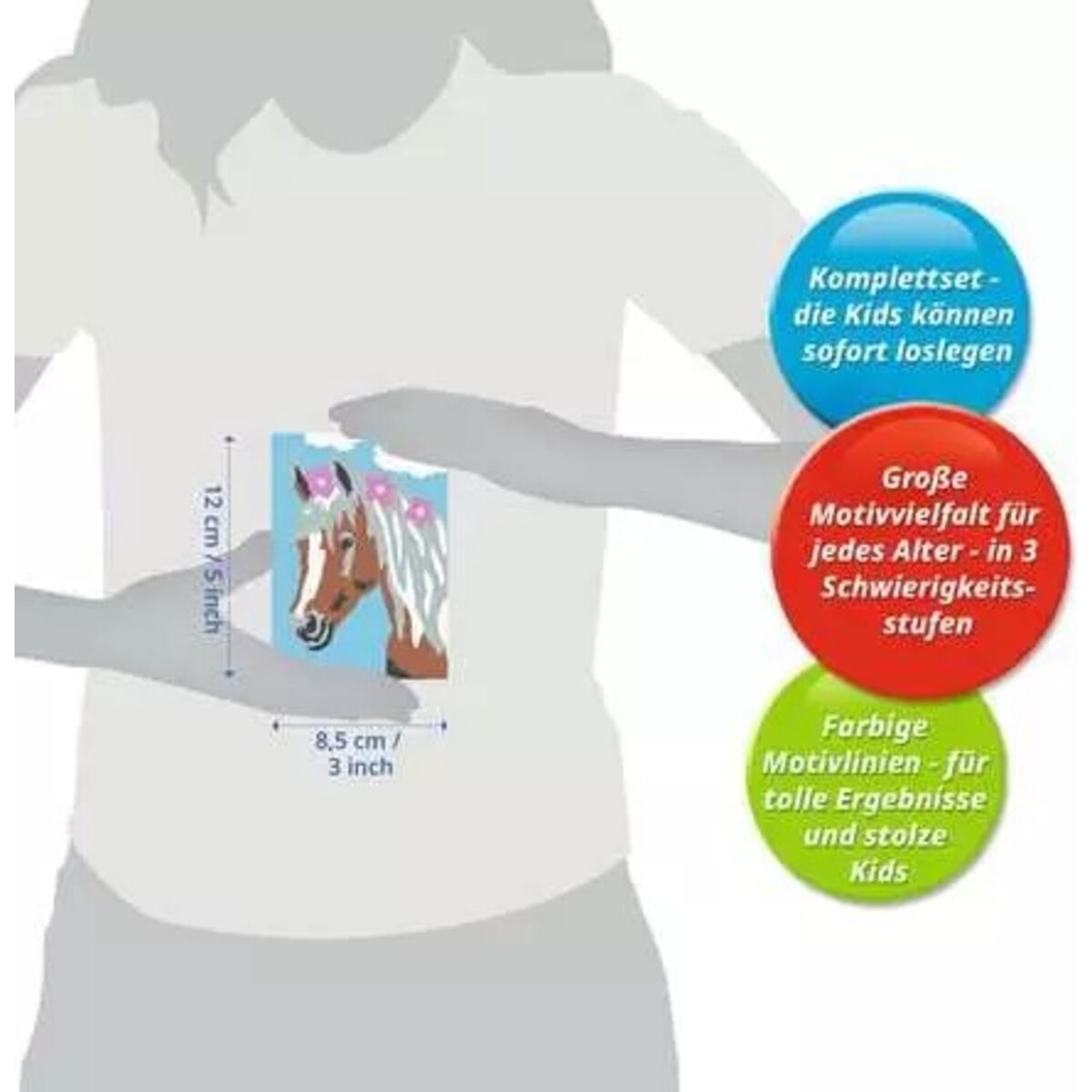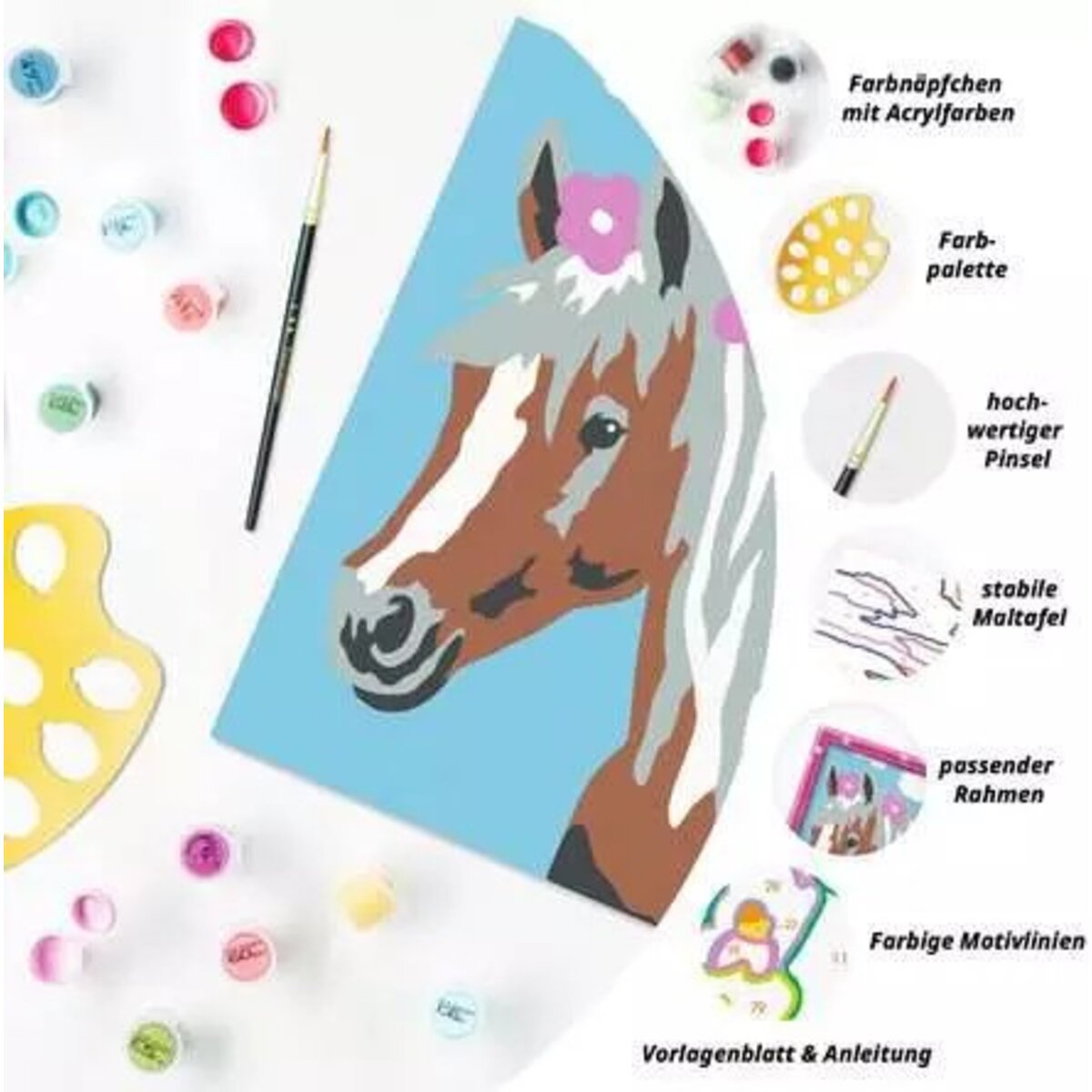 Farbige Motivlinien: Größerer Malspaß & ein schöneres Ergebnis! Dank der farbigen Motivlinien, können die Kinder das ganze Motiv Hübsche Stute und die Farben schneller erkennen. Der Pinsel hat eine gute Führung und so entsteht ein perfektes Bild. Die schönen Motive zum Ausmalen sind eine tolle Geschenkidee für Kinder ab 7 Jahren und eine schöne Dekoration. In diesem Malset sind bereits 5 fertig gemischte Acrylfarben enthalten. Verpackungsdesign kann abweichen. Mit Malen nach Zahlen von Ravensburger lernen die Kinder Flächen sorgfältig auszumalen, ihr Maltalent zu verbessern sowie feinmotorische Fähigkeiten zu entwickeln. Am Ende stehen Freude, Stolz und ein Erfolgserlebnis, das die Lust am Weitermalen weckt. Die Motive sind altersgerecht in drei Schwierigkeitsstufen umgesetzt: von einfachen Bildern mit wenigen, großen Malflächen bis hin zu Bildern mit vielen, kleinen Malflächen für Fortgeschrittene. Jedes Malset enthält alles, was Künstler zum Malen brauchen und es ist kein Mischen der Farben notwendig. Das Ravensburger Malen nach Zahlen Programm bietet eine große Motivauswahl für Kinder und Erwachsene.