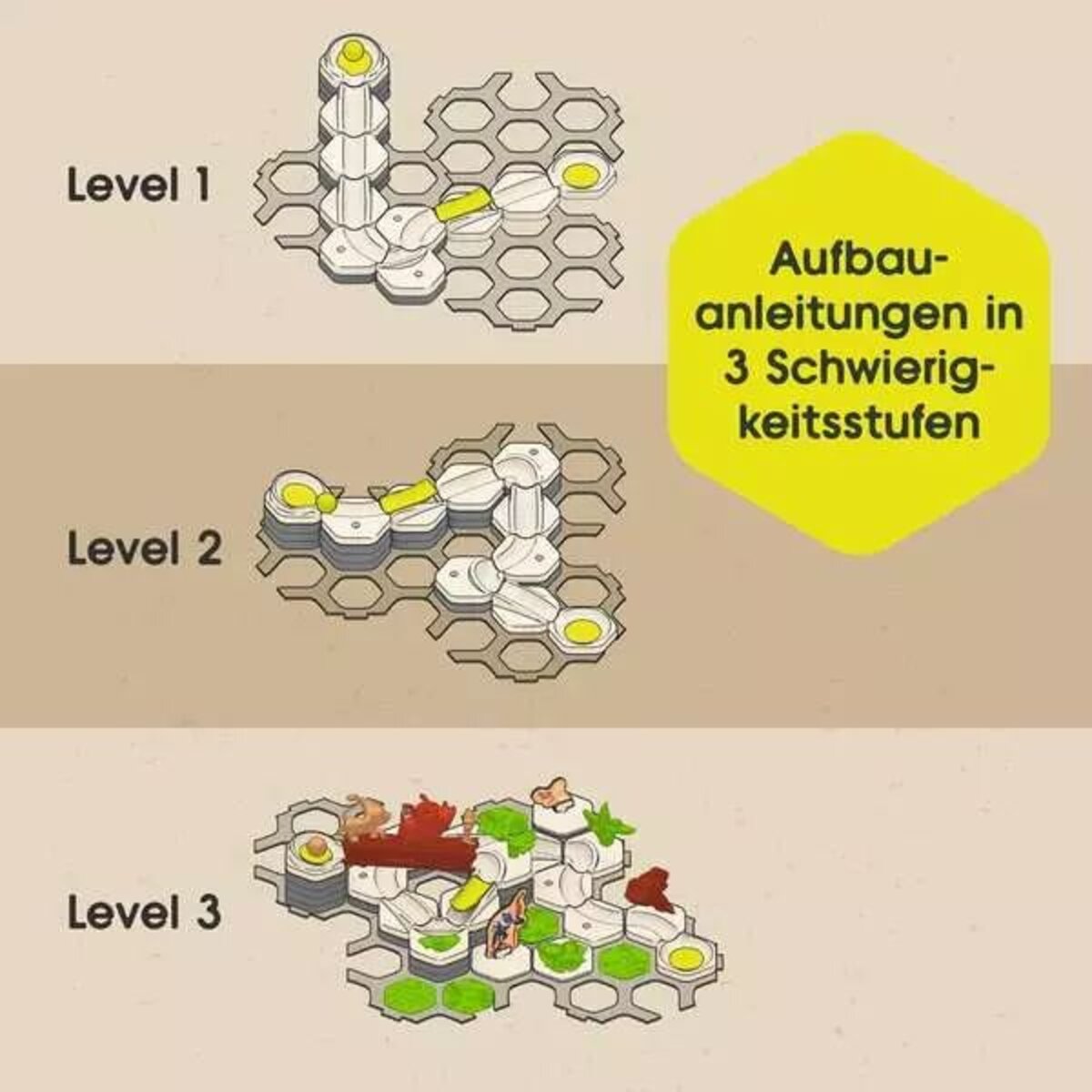 Das GraviTrax Junior Starter-Set Disney Lion King kann durch Extension-Sets, Starter-Sets oder mit Elements erweitert werden. Alle GraviTrax Junior Sets sind miteinander kombinierbar und bestehen überwiegend aus nachwachsenden Rohstoffen. Bei GraviTrax Junior werden altersgerechte Lerninhalte thematisiert. Motorische Fähigkeiten und räumliches Denken werden durch das freie Konzipieren der Kugelbahnen gefördert. Durch das Erforschen des Rollverhaltens der Kugeln wird das Prinzip von Ursache und Wirkung hautnah erlebt.