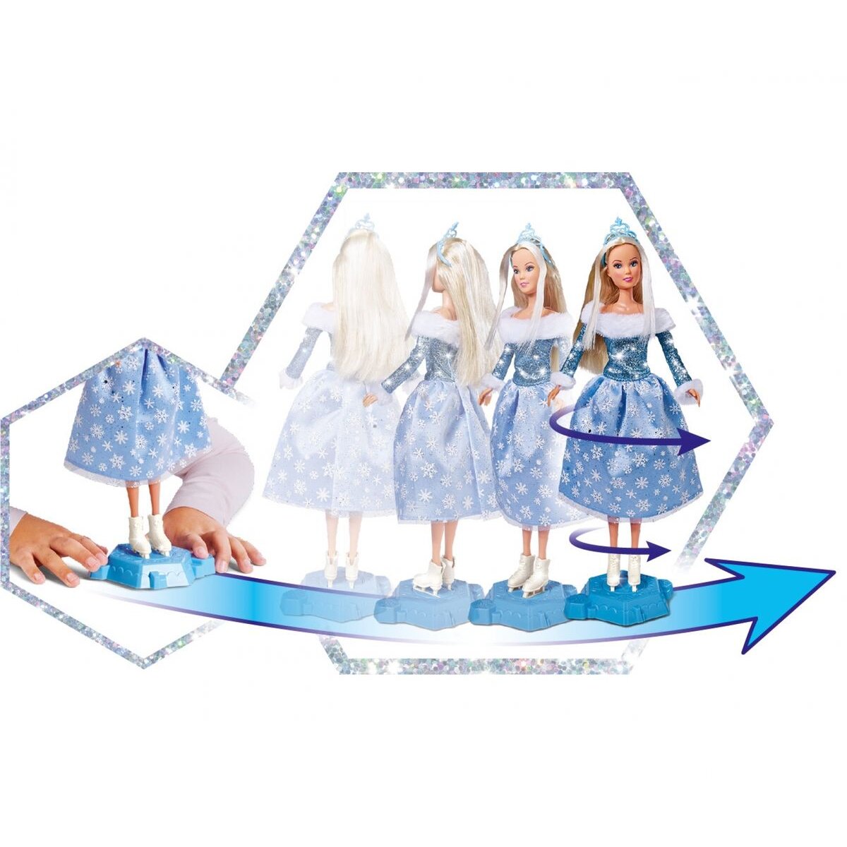 • Mit Funktion - sobald man Steffi mit ihren Schlittschuhen auf die magische blaue Plattform stellt und diese mit den Händen bewegt, beginnt Steffi sich toll zu drehen und präsentiert ihre Eislaufkünste.