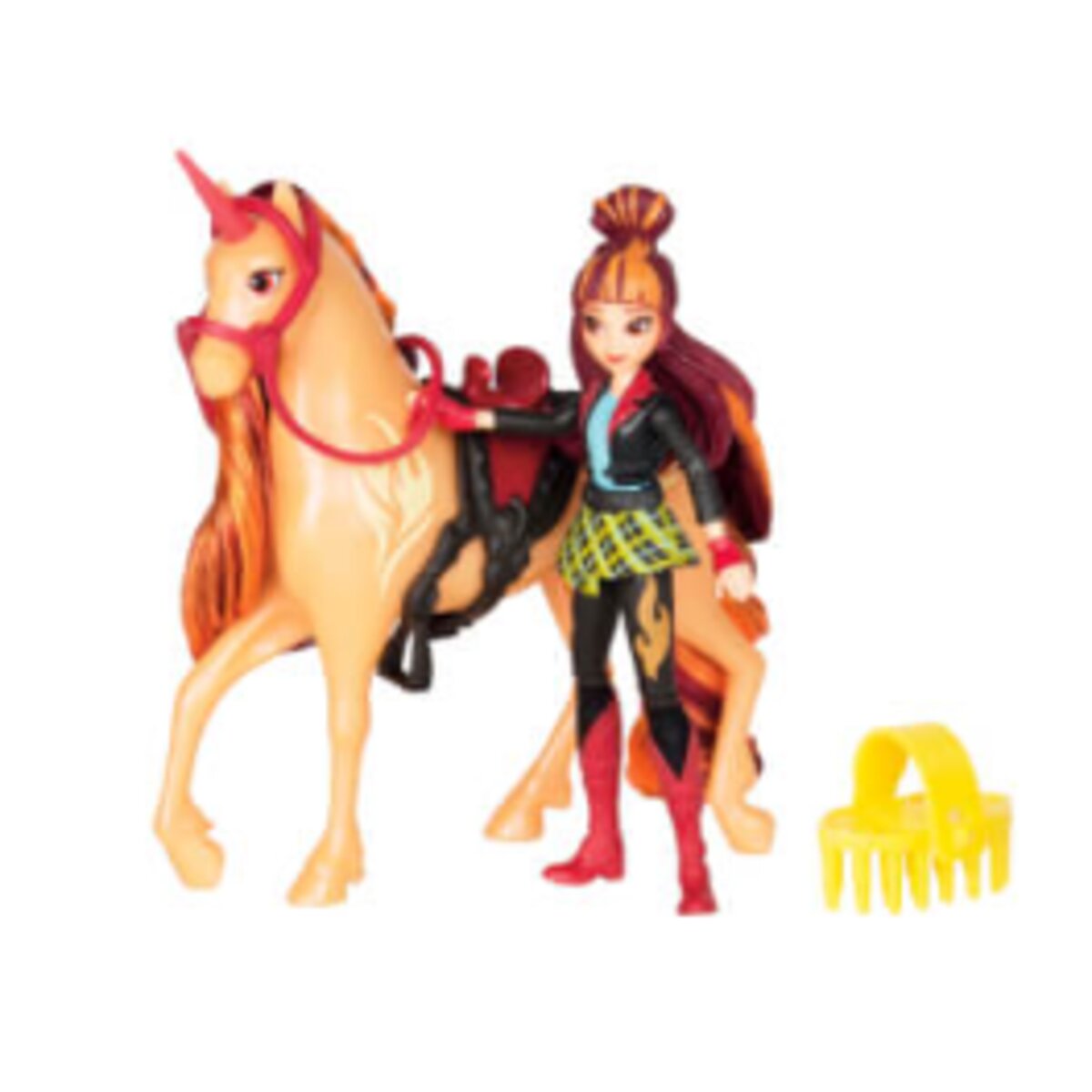 - Inhalt: 1 Puppe ca. 11 cm, 1 Einhorn ca. 12 cm mit abnehmbarem Sattel und Trense, 1 Haarbürste