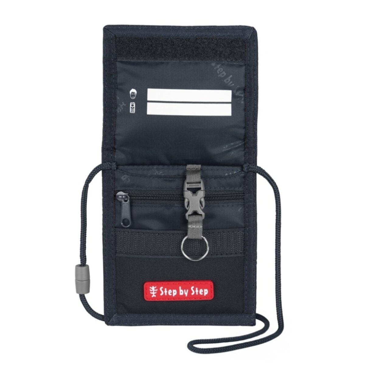 Überblick Klarsichtfach für Busfahrkarte oder Schülerausweis Kleingeldfach mit Reißverschluss Adress-/Namensfeld Klettverschluss Abnehmbarer Schlüsselringbefestigung Umhängeband mit Sicherheitsverschluss Lieferumfang 1 Brustbeutel