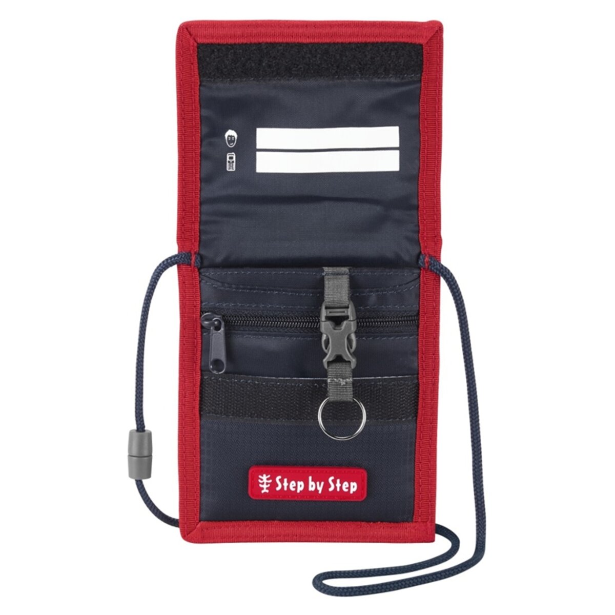 Überblick Klarsichtfach für Busfahrkarte oder Schülerausweis Kleingeldfach mit Reißverschluss Adress-/Namensfeld Klettverschluss Abnehmbarer Schlüsselringbefestigung Umhängeband mit Sicherheitsverschluss Lieferumfang 1 Brustbeutel