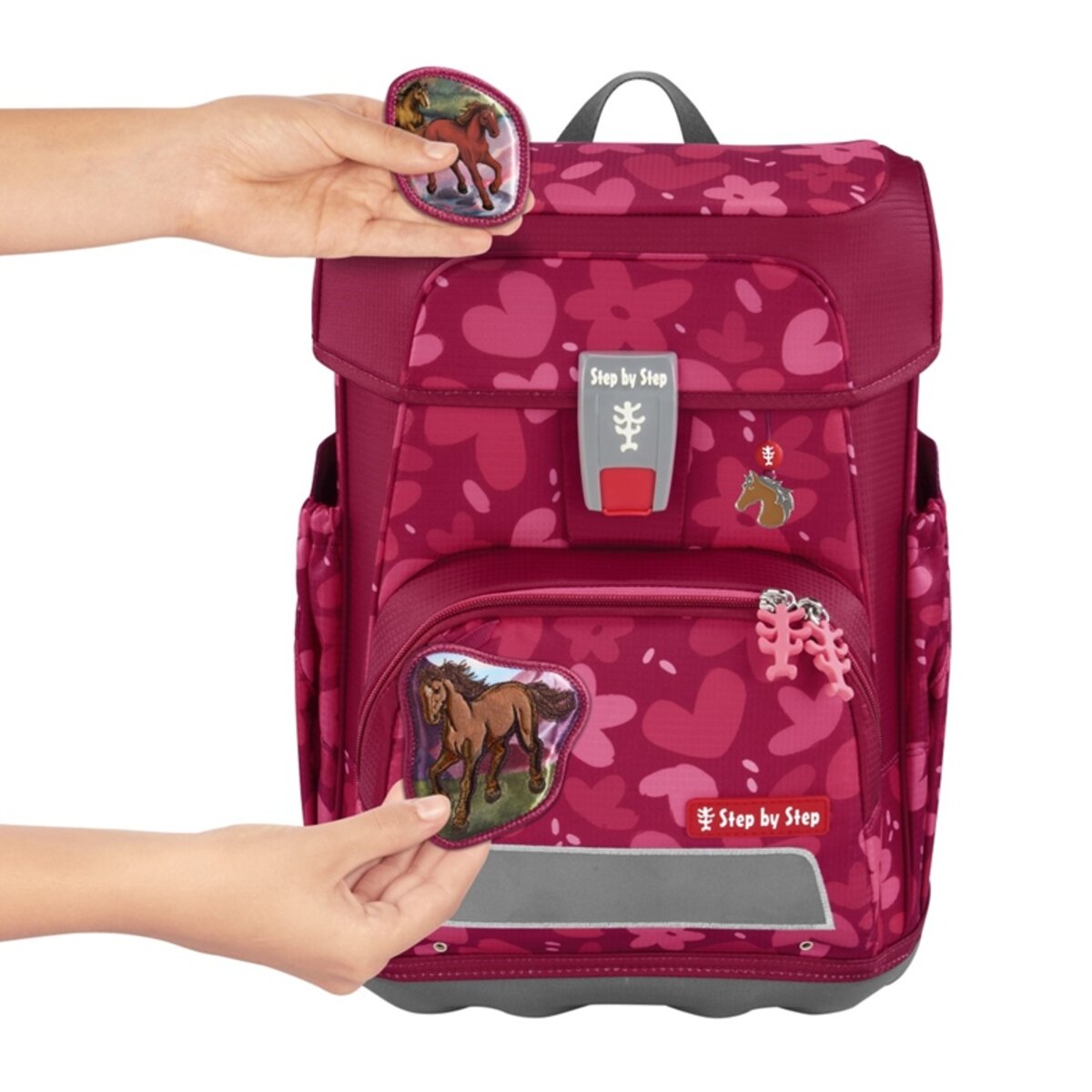 Tragekomfort/Ergonomie Haftung an Step by Step Schulranzen und Rucksäcke mit integrierter Magnetfläche MAGIC MAGS Anhänger wird an der Vorderseite des Ranzens/Rucksacks befestigt Lieferumfang 2 Applikationen 1 Anhänger