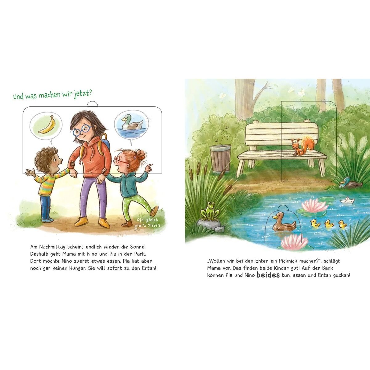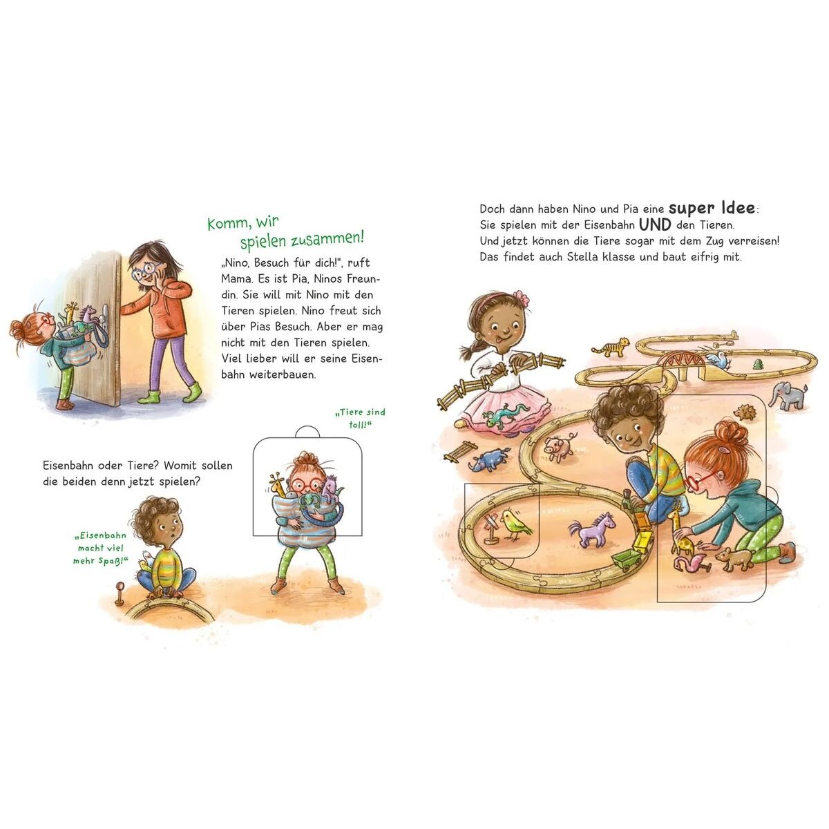Nino und Pia sind Freunde. Sie spielen oft zusammen oder treffen sich mit anderen Kindern. Manchmal herrscht Uneinigkeit und manchmal gibt es auch Streit. Spielen sie mit der Eisenbahn oder Zoo? Auch andere Kinder haben Konflikte – wer darf auf dem Wasserspielplatz die Pumpe drücken und wer lässt die Schiffe fahren? Aber nach jedem Streit kann man sich wieder vertragen: Gemeinsam spielen macht viel mehr Spaß! Manchmal passiert auch mal was: ein Spielzeug landet im Gebüsch oder ein Bauwerk geht kaputt. Wenn alle helfen, sind auch diese Probleme schnell gelöst. Teilen, helfen und sich versöhnen macht glücklich! Ein alltagsnahes und witziges Klappenbuch für Jungen und Mädchen ab 2 Jahren.
