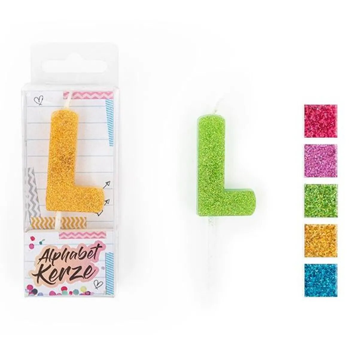 Trendhaus FESTIVAL FEELINGS Alphabet Kerze Glitzer L, 1 Stück, 5-fach sortiert