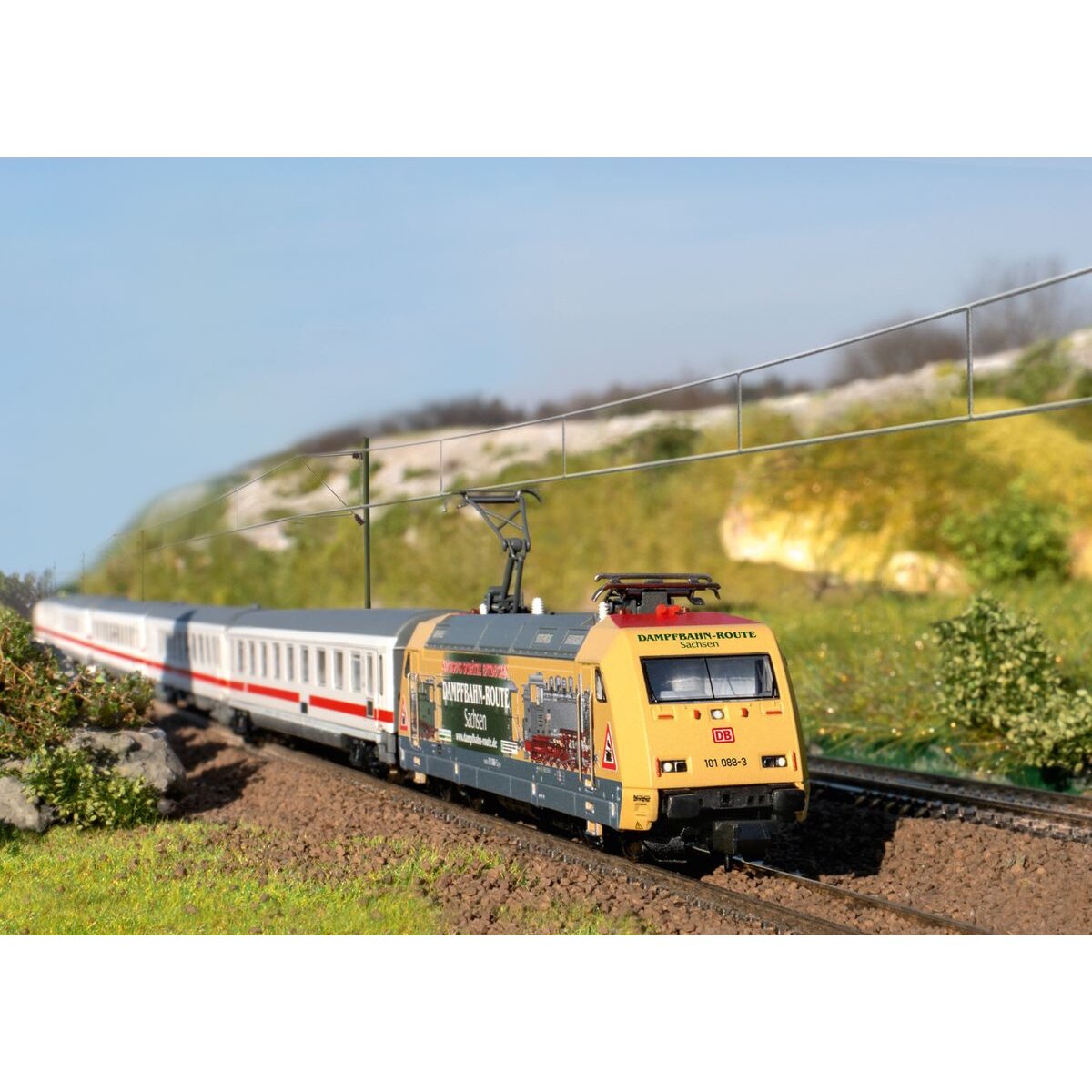 Vorbild: Schnellzuglokomotive 101 088-3 der Deutschen Bahn AG (DB AG). Werbegestaltung "DAMPFBAHN-ROUTE Sachsen". Aktueller Betriebszustand 2022.