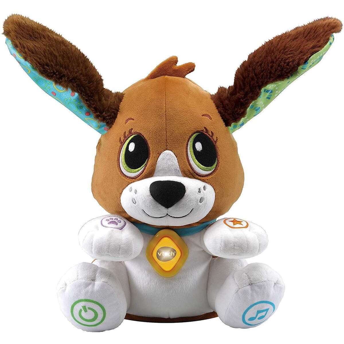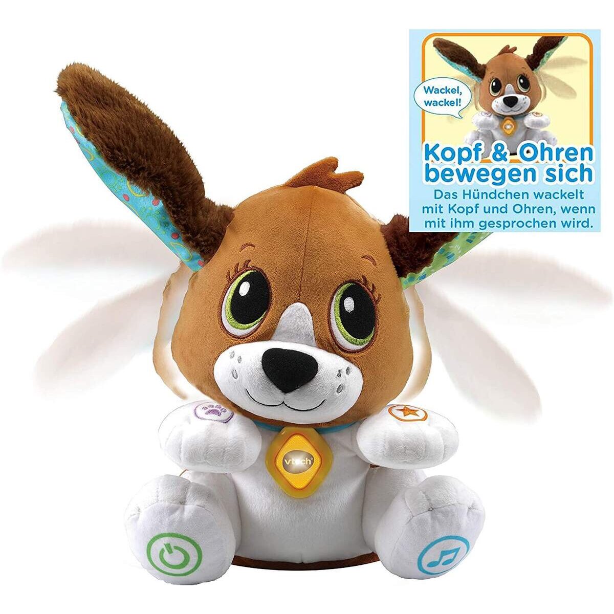 Mit dem kleinen, süßen Welpen kuschelige Lernabenteuer erleben . Kleiner Plüschwelpe unterstützt das Erlernen von. Buchstaben, Zahlen, Sprache und den Ausdruck von Emotionen. Sprachliche Interaktion durch Sprachrecorder mit lustigem Stimmverzerrer . Der Welpe bewegt seinen Kopf und wackelt mit den Ohren . Vier verschiedene Spielmodi regen zum Sprechen, Nachsprechen und lernen von Zahlen, Farben und Buchstaben . Drei Spielstufen im Sprachlernmodus. Vier bunte Tasten auf den Pfoten des Welpen, eine aufleuchtende Taste am Halsband . Flauschige Oberfläche lädt zum Kuscheln ein . Drei gesungene Lieder und zahlreiche lustige Geräusche. Abschaltautomatik, kindersicheres Batteriefach und Lautstärkeregler . Demobatterien enthalten