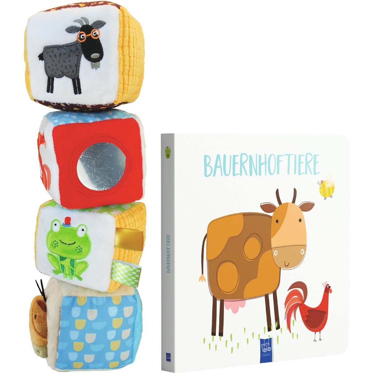 Diese Geschenktasche, bestehend aus einem Pappbilderbuch und 4 Soft-Würfeln, ist eine sensorische Entdeckungsreise für Kleinkinder: Die vielseitigen Spieleffekte der Soft-Würfel, zum Beispiel gestickte Bilddetails, eine versteckte Quietsche und Rassel, ein Spiegel, Satinbänder, Knisterfolie oder ein verstecktes Glöckchen schulen die Feinmotorik und die sensorische Entwicklung von Kleinkindern. Im farbenfrohen Pappbilderbuch lernen Kleinkinder sowohl die Farben als auch die Bauerhoftiere zu benennen.